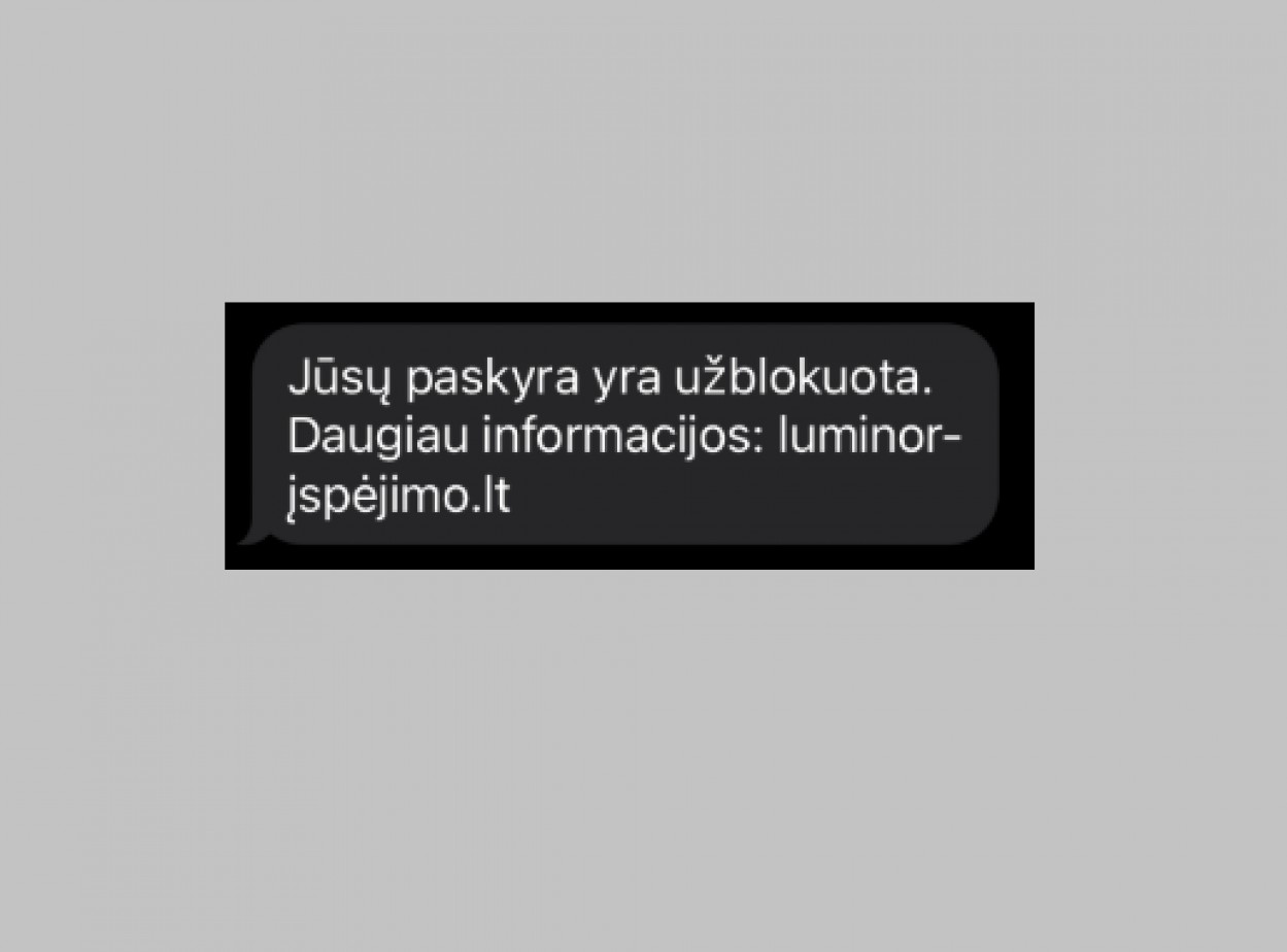 „Luminor“ bankas perspėja, jog per pastarąją parą kai kurie banko klientai sulaukė neva banko vardu siunčiamų trumpųjų žinučių apie jų paskyros blokavimą. Šiose žinutėse pridedama nuoroda, kurią paspaudus prašoma suvesti kliento prisijungimo duomenis. Bankas įspėja jokių nuorodų nespausti, o kilus abejonėms ragina naudotis oficialiai skelbiama informacija banko svetainėje ir nedelsiant susisiekti su banko darbuotojais.
