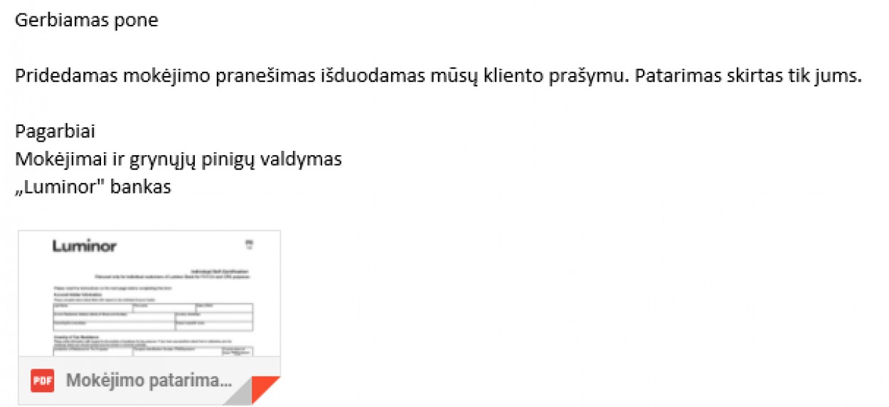 Antruoju „Luminor“ fiksuojamu sukčiavimo scenarijumi nusikaltėliai banko vardu klientams siunčia elektroninius laiškus su priedais. Anot L. Sadecko, atidarius laiško priedą asmens kompiuteris užkrečiamas kenkėjiška programa, kuri gali rinkti privačius duomenis ar užrakinti kompiuterį tol, kol nusikaltimo auka sutiks sumokėti išpirką nusikaltėliui.