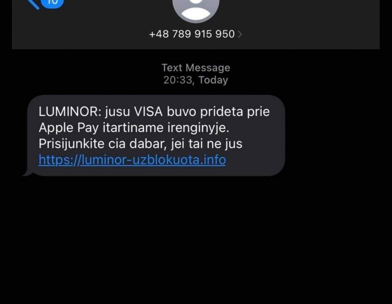„Luminor“ banko klientai pastarosiomis dienomis gauna pranešimus, kad „jūsų VISA buvo pridėta prie Apple Pay įtartiname renginyje“ ir raginimus prisijungti prie atsiųstos nuorodos. Paspaudus ją, atsidaro langas, kuris labai panašus į elektroninės bankininkystės puslapį mobilioje programėlėje.