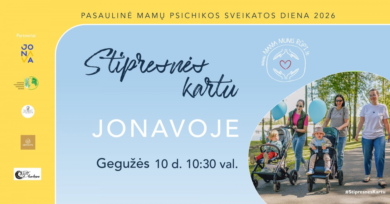 Mamos kartais eina, kartais – bėga. Dažnai pavargsta, bet kasdien vėl keliasi ir eina paskui savo vaikus. Motinystė – tai visas emocijų spektras, kuriame telpa ne tik džiaugsmas, bet ir nuovargis, nerimas, liūdesys ar perdegimas. Šiemet Pasaulinę mamų psichikos sveikatos dieną Lietuvoje minime jau ketvirtą kartą, kviesdami į pasivaikščiojimus „Stipresnės kartu“, kurie vyks daugiau nei 30 Lietuvos miestų. Tai paprastas susitikimas ir pasivaikščiojimas, skirtas pabūti kartu – su kitomis mamomis, šeimomis ir žmonėmis, kuriems rūpi mamų emocinė sveikata. Tai nėra sporto renginys – eisime ramiu tempu, su vežimėliais, su vaikais ar tiesiog savo žingsniu.