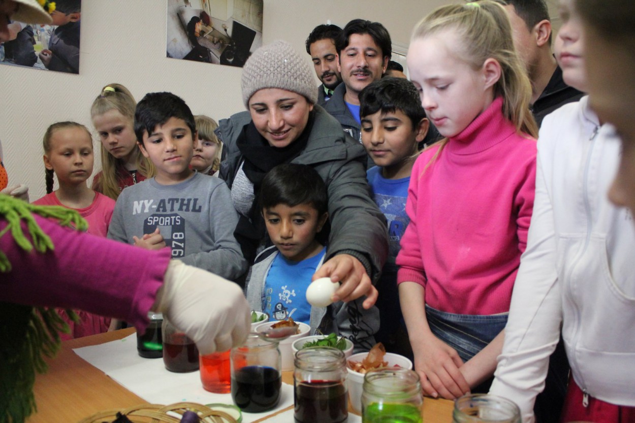 Tiesa, kiaušinių marginimas sulaukė ne tik vaikų, tačiau ir suaugusiųjų dėmesio – atvykėliai iš Sirijos mielai patys margino kiaušinius bei domėjosi būdais, kaip Velykoms dažomi kiaušiniai.