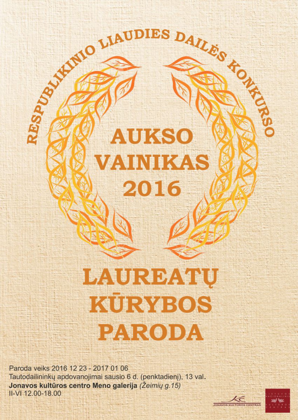 Jonavos kultūros centro Meno galerijoje gruodžio 23 d., penktadienį, duris atvers liaudies dailės konkurso „Aukso vainikas“ laureatų kūrybos paroda. Joje liaudies menininkai pristatys geriausių savo darbų kolekcijas iš medžio, metalo, keramikos, taip pat austų audinių bei tapytų paveikslų.