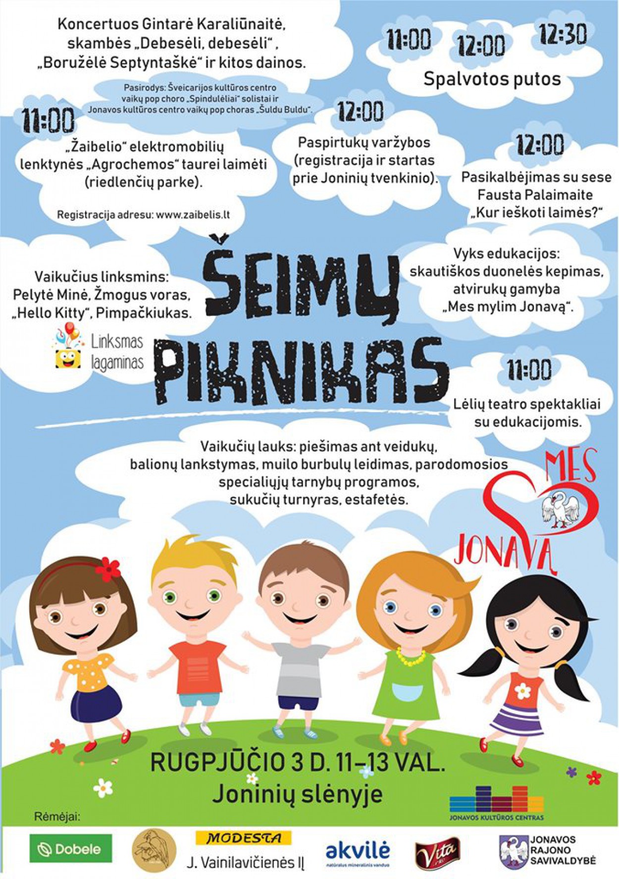 ,,11 valandą prasidės šeimų piknikas. Nuo pat jo pradžios susirinkusieji galės mėgautis šventiniu koncertu – scenoje pasirodys Šveicarijos kultūros centro vaikų pop choro ,,Spindulėliai“ solistai, Jonavos kultūros centro vaikų pop choras ,,Šuldu Buldu“, žinoma dainininkė Gintarė Karaliūnaitė. 11, 12 ir 12.30 valandą vyks spalvotų putų šou. 11 valandą bus rodomi Lėlių teatro spektakliai. Vaikų Joninių slėnyje lauks piešimas ant veido, balionų lankstymas, muilo burbulų leidimas, parodomosios specialiųjų tarnybų programos bei ne vienas personažas: Pelytė Minė, Žmogus voras, ,,Hello Kitty“, Pimpačkiukas“, - šeimų pikniko programą aptarė J. Driukienė.