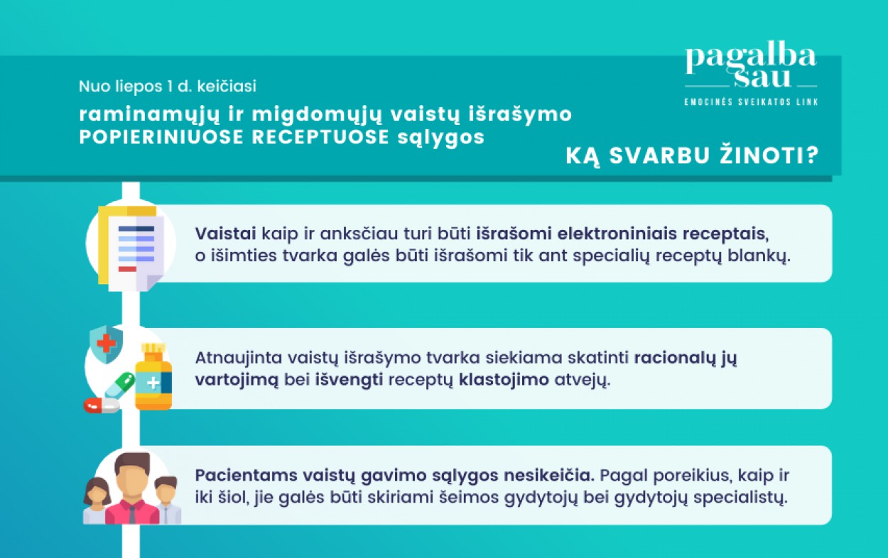 Nuo liepos 1 d. migdomieji ir raminamieji vaistai išrašomi elektroniniuose receptuose arba specialiame popierinio recepto blanke – rožiniame recepte. Jų skyrimo ir išrašymo tvarka iš esmės nesikeičia. Gyventojai gaus jiems reikalingus vaistus, gydytojai, kaip ir iki šiol, išimtiniais atvejais galės išduoti ir popierinius – rožinius receptus.
