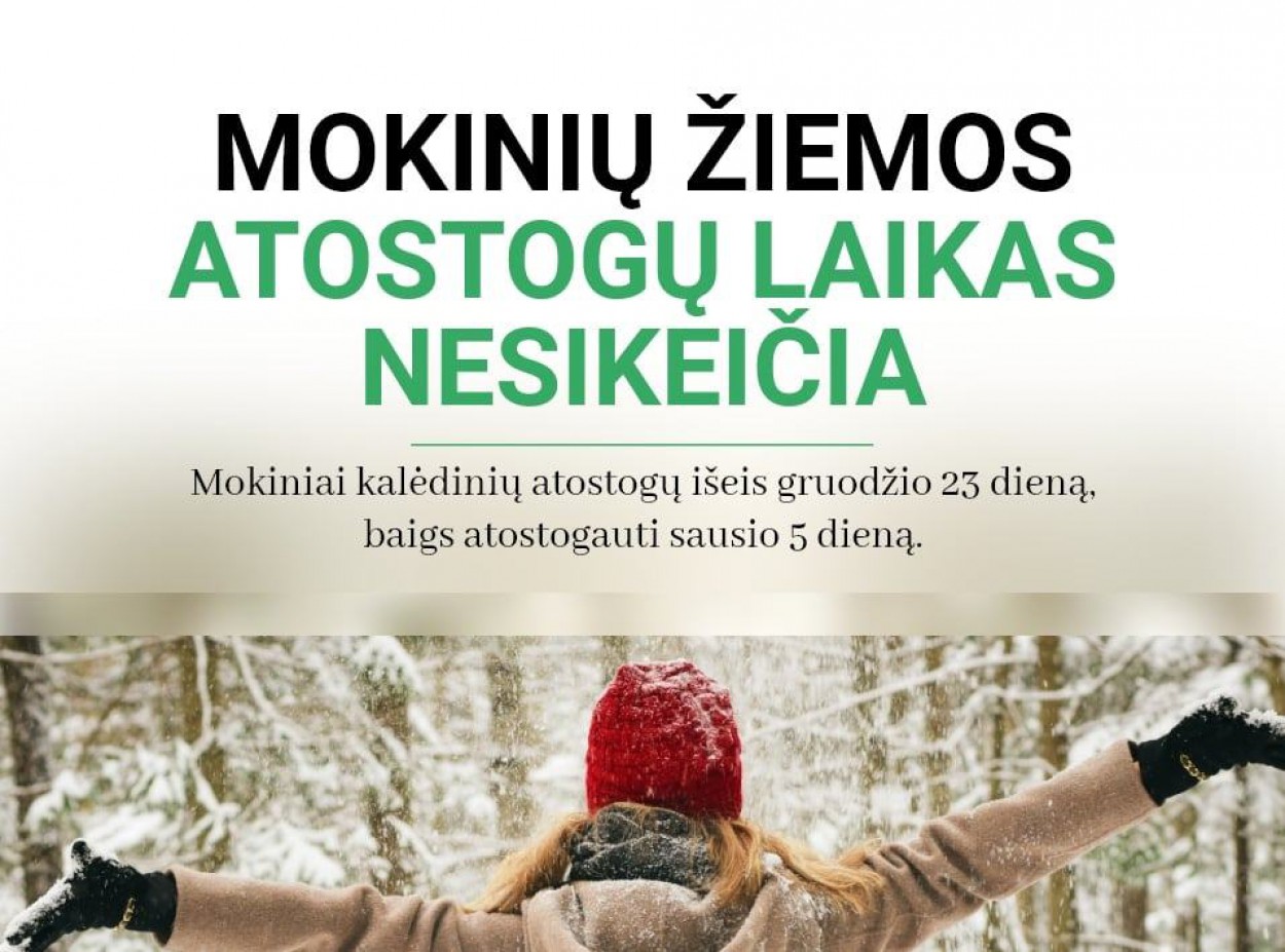 Švietimo, mokslo ir sporto ministerija, kartu su epidemiologais išanalizavusi situaciją švietimo įstaigose, mokinių žiemos atostogų laiko nusprendė nekeisti.Mokiniai kalėdinių atostogų išeis gruodžio 23 dieną, baigs atostogauti sausio 5 dieną. Nesiūloma įvesti ir visuotinio nuotolinio mokymo.
