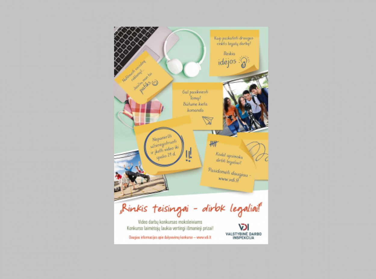 Valstybinė darbo inspekcija (VDI) kviečia vyresniųjų klasių moksleivius dalyvauti video darbų konkurse „Rinkis teisingai – dirbk legaliai!“, kuriuo skatina jaunuolius suprasti legalaus darbo naudą prieš įsiliejant į darbo rinką.