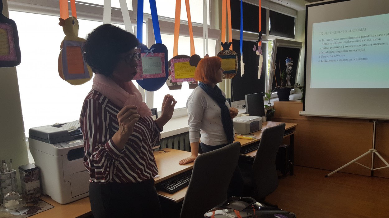 Mokytojai susibūrė skaitykloje ir svarstė apie darbo su emigrantais iššūkius. Justino Vareikio progimnazijos direktorė Olga Mediekšė džiaugėsi tokiu gausiu būriu svečių ir noriai dalinosi patirtimi. Ji kalbėjo, jog tai labai atsakinga ir daug dėmesio reikalaujanti sritis. Reikia suprasti šalies, iš kurios atvyksta emigrantas, kultūrą, padėti jam įsilieti į mokyklos gyvenimą. Pavyzdžiui, reikėjo paruošti klasės vaikus tam, jog mergaitė iš Sirijos dėvės hidžabą. Dabar mokiniai reaguoja labai natūraliai ir noriai bendrauja, mergaitė jaučiasi gerai. Atvyksta šeimų su skirtingomis patirtimis. ,,Vieni vaikai labai greitai išmoksta lietuvių kalbą, kitiems sekasi sunkiau, bet mes jiems padedame ir džiaugiamės kiekvienu pasiekimu“,- kalbėjo direktorė.