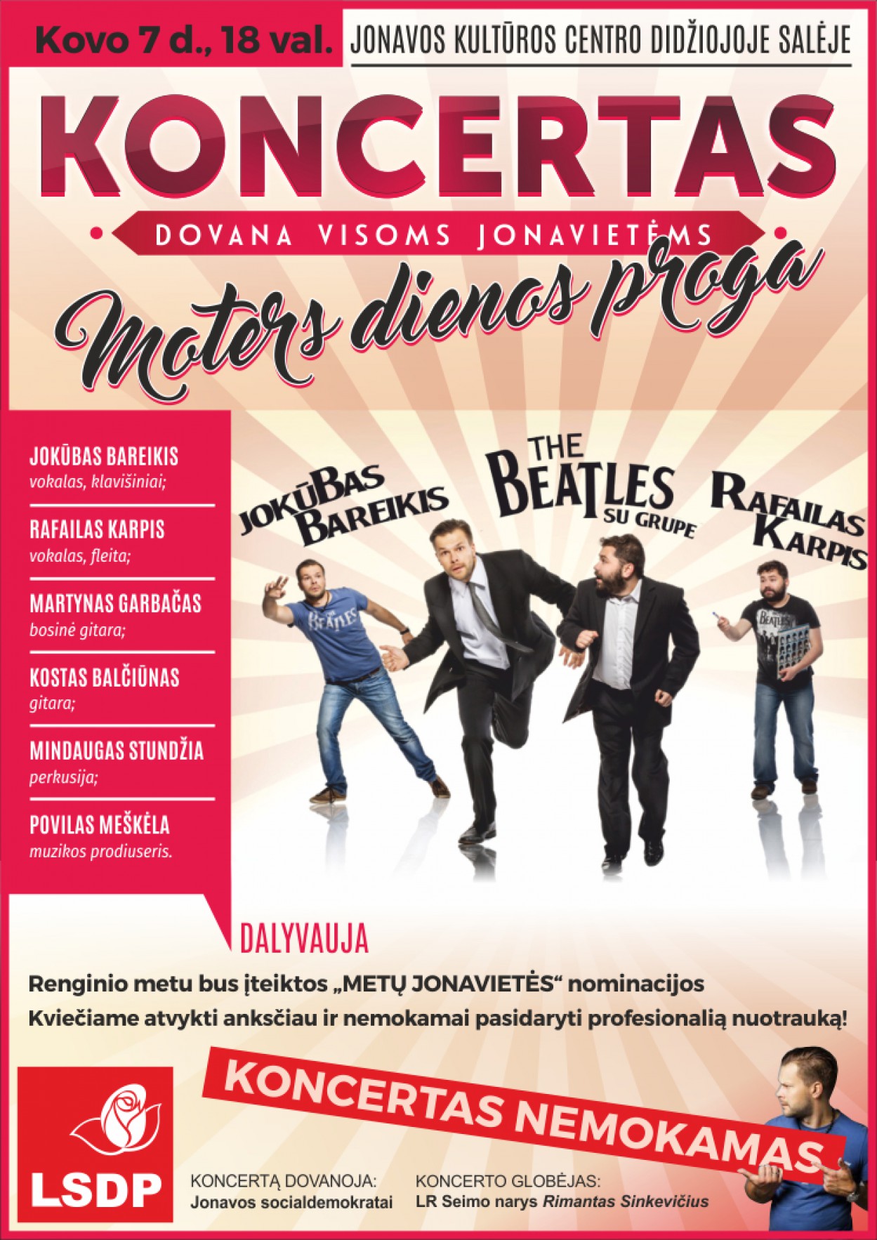 Artėjant Tarptautinei Moters dienai, Jonavos socialdemokratai visas moteris kviečia paminėti šią šventę neeiliniame koncerte – „THE BEATLES istorija“. Jausmingame teatralizuotame koncerte - muzikos grandai Rafailas Karpis ir Jokūbas Bareikis pasakos grupės THE BEATLES istoriją.