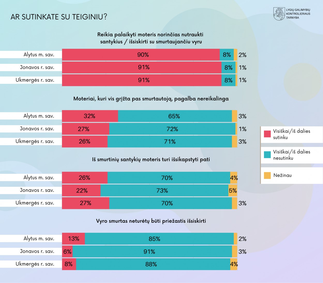 Dalis apklausos dalyvių laikėsi nuomonės, kad iš smurtinių santykių moteris turi išsikapstyti pati – tokių buvo 25 proc. Labiausiai tam pritarė Ukmergės (27 proc.) ir Alytaus (26 proc.) gyventojai. Mažiausiai – apklaustieji Jonavoje (22 proc.). Iš viso 9 proc. teigė, kad vyro smurtas neturėtų būti priežastis išsiskirti. Alytuje taip manančiųjų procentas siekė 13, Ukmergėje – 8, Jonavoje – 6.