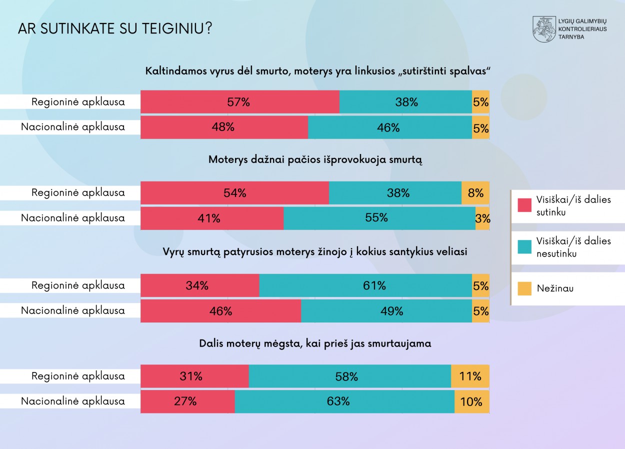 Didžiausi skirtumai tarp gautų rezultatų atsiskleidžia pažvelgus į respondentų nuomonę apie moteris kaltinančius teiginius. Daugiau nei pusė (54 proc.) apklaustųjų sutiko, kad „moterys dažnai pačios išprovokuoja smurtą“. Tai 12 proc. daugiau nei tų, kurie šiam teiginiui pritarė nacionalinės Lietuvos gyventojų apklausos metu 2019 m. (tokių tada buvo 41 proc.).