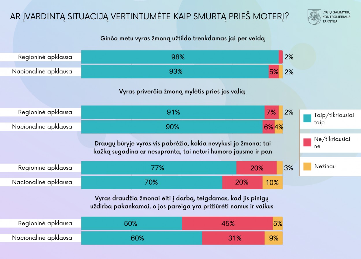 Siekiant įvertinti, ar gyventojai atpažįsta skirtingas smurto formas, apklausos metu jiems buvo įvardintos situacijos, klausiant, ar jie tai laikytų smurtu. Dažniausiai regionų respondentai smurtines situacijas atpažino lengviau nei nacionalinės apklausos dalyviai.