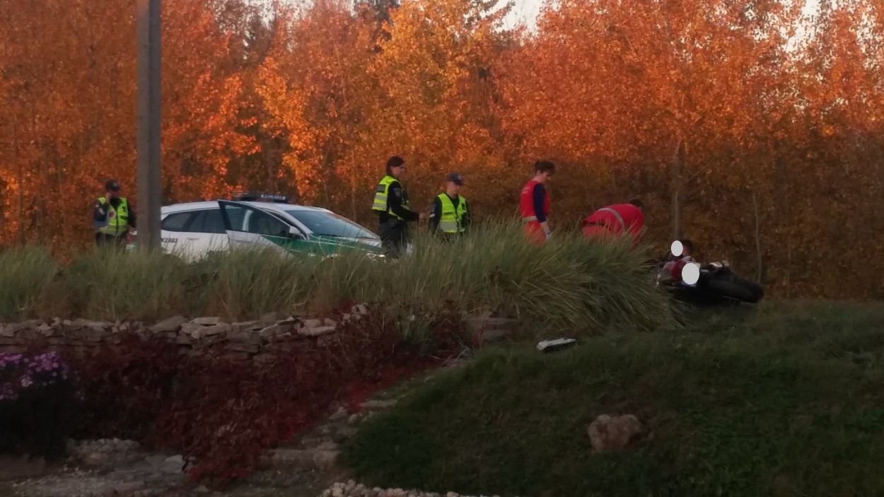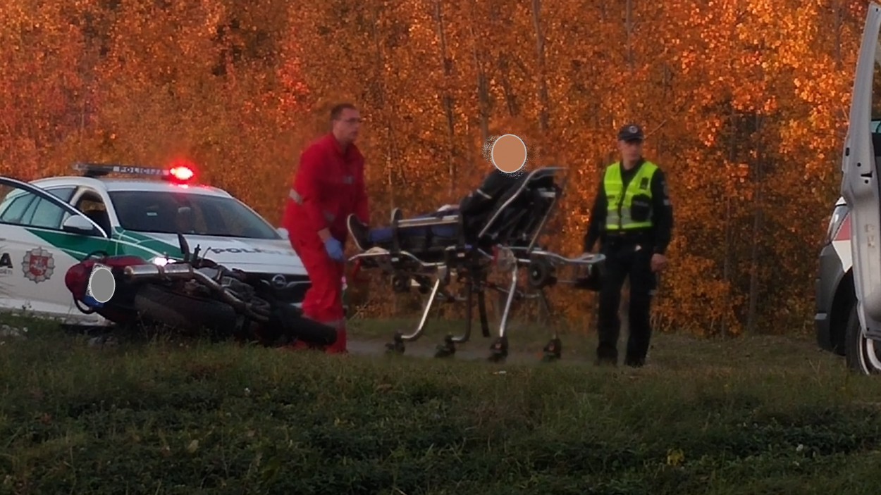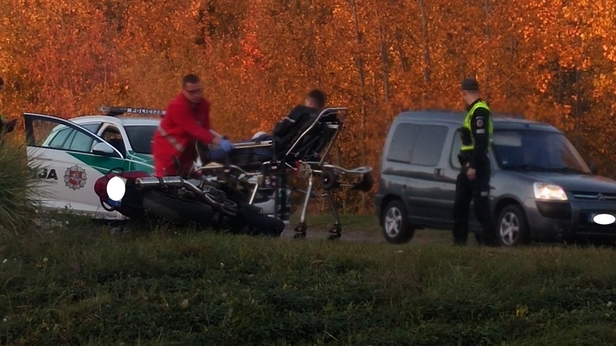 Motociklas Kawasaki išvažiavęs iš posūkio, nepraleido pagrindiniu keliu vykusio lengvojo Citroen automobilio, ko pasekoje, įvyko susidūrimas. Apgadintos abi transporto priemonės. Kawasaki vairuotojas išvežtas į gydymo įstaigą, po medikų apžiūros išleistas namo. Motociklininkas patyrė nubrozdinimus, sumušimus, laimei - rimtų traumų išvengė.