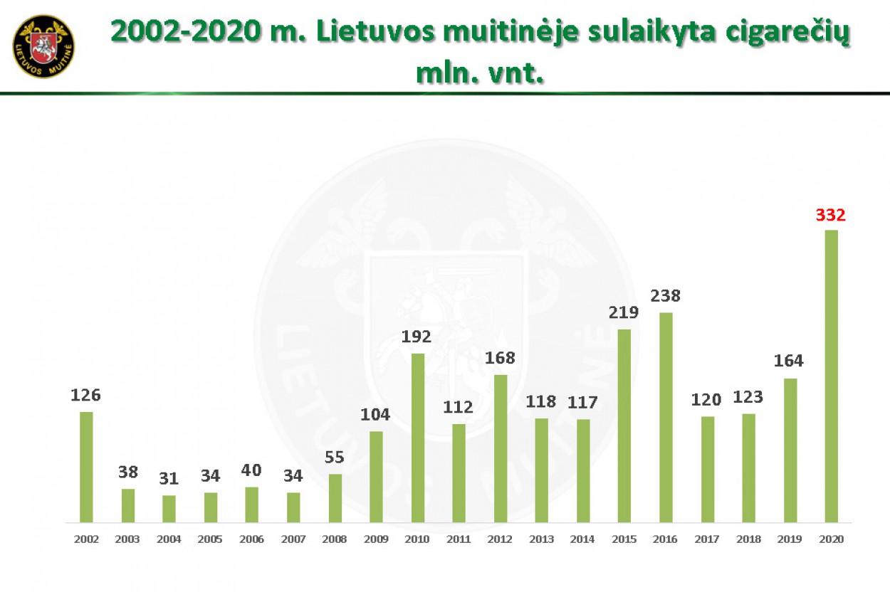 Pirmiausia, kaip ir prognozuota, 2020 m. muitinės pareigūnai susidūrė su beprecedenčiu tiek savo mastais, tiek gabenimo būdų įvairove cigarečių kontrabandos srautu iš Baltarusijos. Šiam iššūkiui sugebėta laiku ir deramai pasiruošti – Lietuvos muitininkai jau antrus metus iš eilės muša sulaikytos cigarečių kontrabandos rekordus. Suskaičiavus ikiteisminiuose tyrimuose muitinės kriminalistų sulaikytas cigaretes, paaiškėjo, kad pernai pareigūnams įkliuvo beveik 60 mln. eurų vertės nelegalių rūkalų – iš viso 16,6 mln. pakelių. Beje, 2019 m. irgi buvo rekordiniai, atitinkamai sulaikyta 8,2 mln. (o 2018 m. – 6 mln.) pakelių kontrabandinių cigarečių. Taip pat 2020 m. buvo sulaikyta ir 28,4 tonos tabako (2019 m. – 21, 6 t).