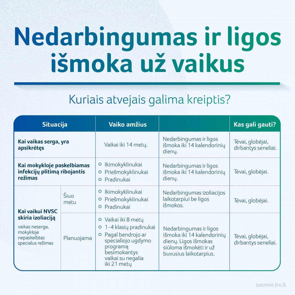 KAI VAIKAS SERGA, APSIKREČIA. Kai vaikas serga bet kokia liga arba užsikrečia COVID-19, jo tėvai, globėjai ir dirbantys seneliai gali gauti nedarbingumą ir ligos išmoką sergančio vaiko iki 14 metų slaugymui ne ilgiau nei 14 kalendorinių dienų.