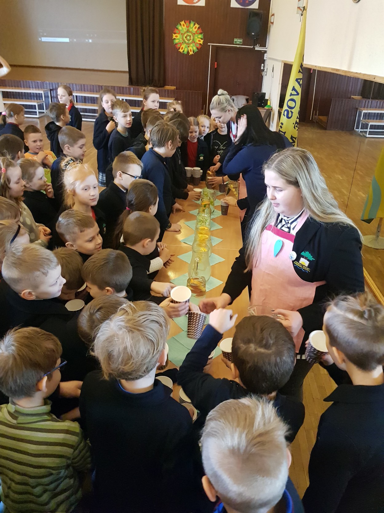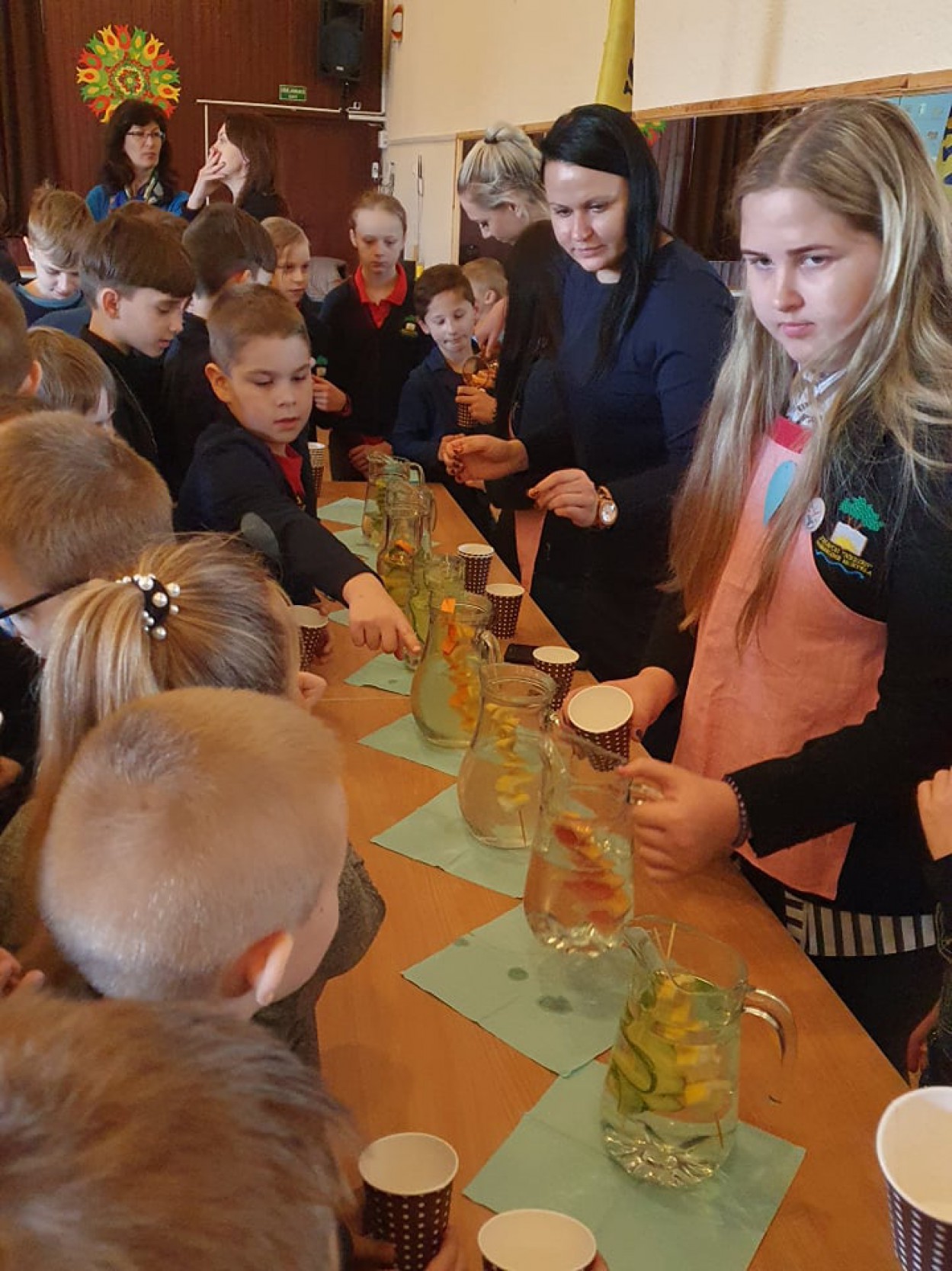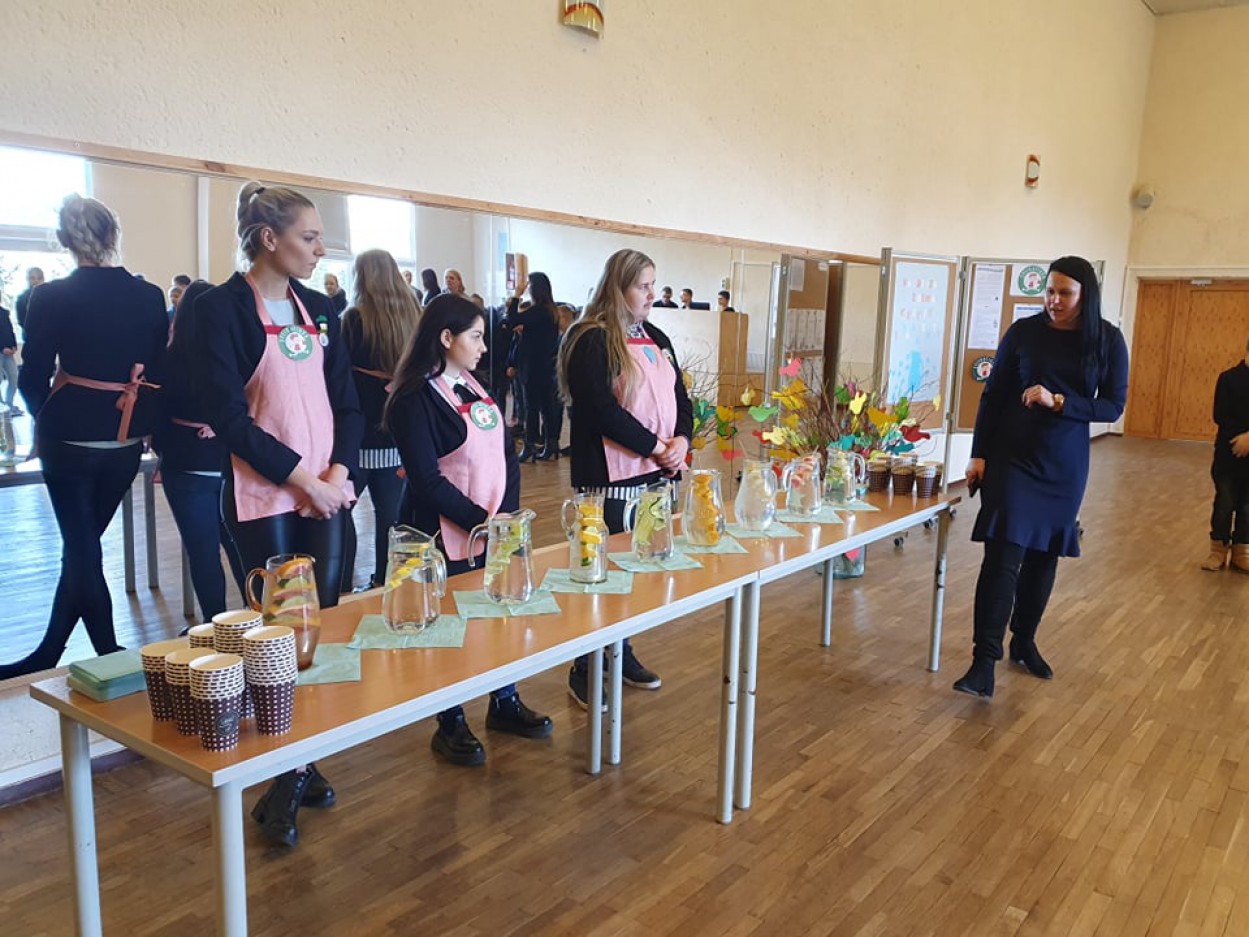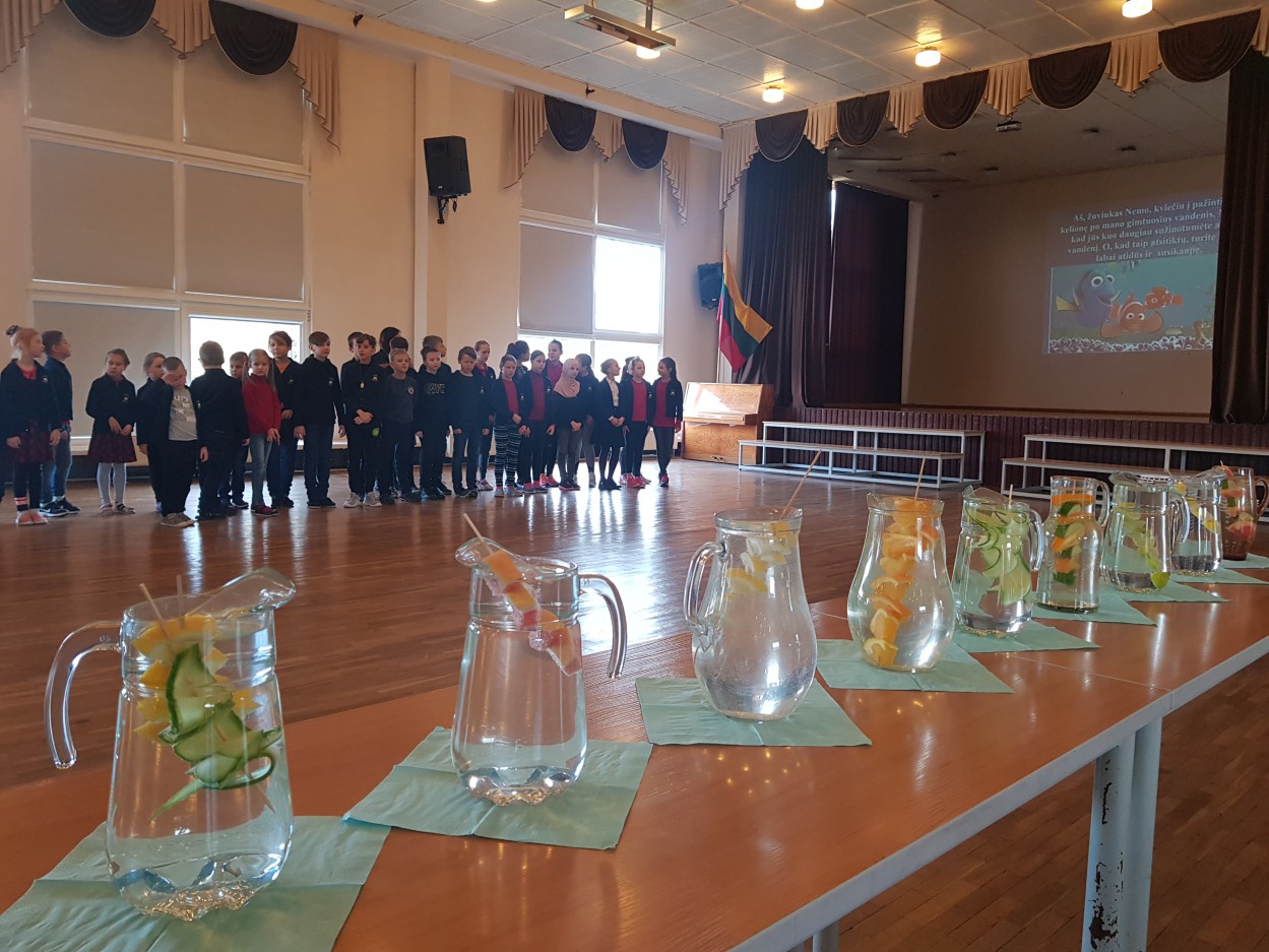 Technologijų mokytoja D.Grinė ir mokyklos savanorių komanda pristatė su įvairiais vaisiais ir daržovėmis paruoštą vandenį. Ąsočiuose puikavosi apelsinais, citrinomis, greipfrutais, agurko griežinėliais pagardintas vanduo. Vanduo įgavo įdomesnę spalvą ir skonį. Mokiniai buvo kviečiami degustuoti skirtingus gėrimus ir išsirinkti skaniausią. Netilo diskusijos, kiekvienas galėjo pasirinkti vandenį pagal savo skonį.