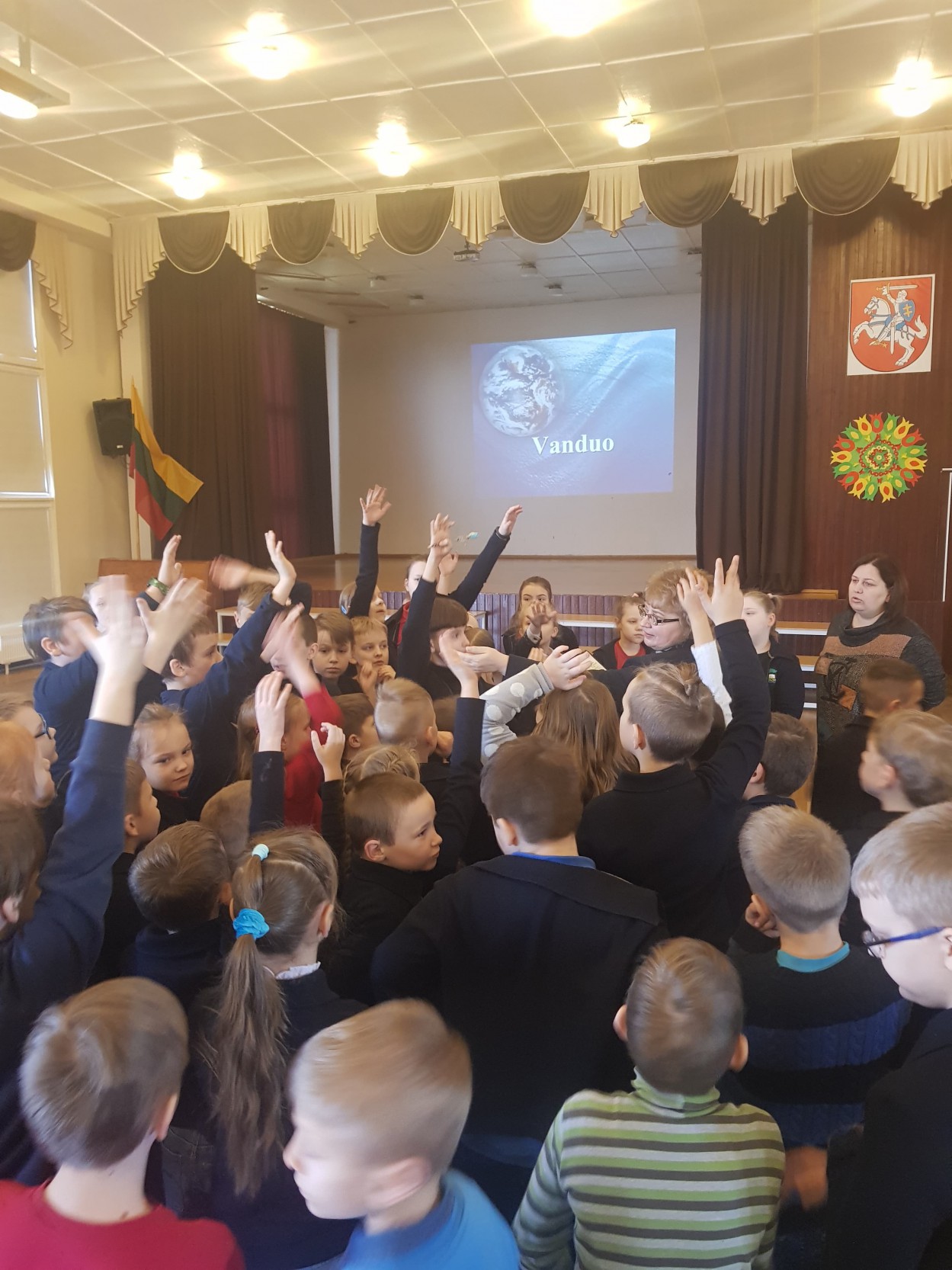 Tikime, kad mokiniai iš šios pamokos išėjo daug sužinoję ne tik apie vandenį ir jo svarbą žmogui, bet ir supratę, kaip svarbu taupyti vandenį, nes jis didžiausias turtas pasaulyje. Kovo 22d. minima pasaulinė vandens diena. Kviečiame visą mokyklos bendruomenę pasitikti ją keičiant savo įpročius ir troškulį malšinti vandeniu, o ne saldintu gėrimu. Tegul Mūsų mitybą puošia ne tik vaisiai ir daržovės, grūdiniai produktai, bet taip pat tegul vanduo išstumia saldintus gėrimus!