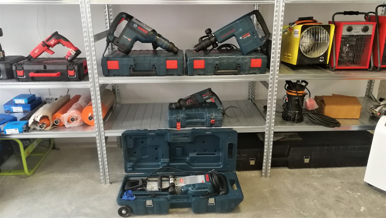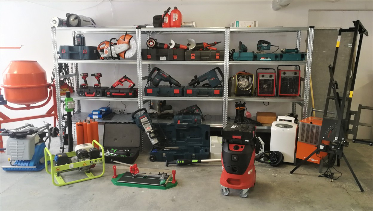 Vibro plokštės, betono pjūklai, siaurapjūkliai, kampiniai šlifuokliai, betono šlifavimo aparatas, skardos žirklės, skėlimo plaktukai, vandens ištraukimo siurblys – įrankiai Jūsų patogumui.