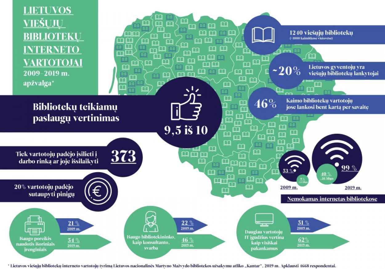 Net 99 proc. bibliotekų teikia galimybę naudotis nemokamu internetu (2009 m. tokių buvo 53 proc.). Palyginti su 2009 m., reikšmingai pagerėjo bibliotekų lankytojų informacinių technologijų naudojimo įgūdžiai. 2019 m. 62 proc. vartotojų naudojimosi kompiuteriu įgūdžius vertino kaip „visiškai pakankamus“, 2009 m. tokių buvo – 51 proc. Prieš dešimt metų viešąja interneto prieiga bibliotekose aktyviai naudojosi 15–24 metų žmonės, o dabar didžiausią vartotojų dalį sudaro 45–64 metų auditorija.