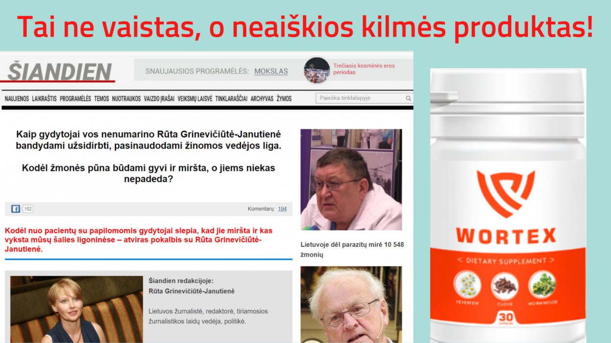 VVKT informuoja, kad vienoje iš veikiančių interneto svetainių (tinklalapių) pateikiama informacija apie „stebuklingą“ preparatą nuo parazitų „Wortex“, kuris neva platinamas pagal specialią valstybinę programą, praktiškai nemokamai. Tinklalapyje melagingai teigiama, kad „gydytojai dažniau nori išrašyti pacientams brangius preparatus ar procedūras, kadangi už tai gauna savo dalį, o ne rekomenduoti šį pigų preparatą“. Klaidingai nurodoma, kad Sveikatos apsaugos ministerija (SAM) rado šios situacijos sprendimą. Rašoma, kad SAM neva sukūrė specialią užsakymo formą, kurioje užklausą gali pateikti bet kuris valstybės gyventojas. Raginama šioje formoje palikti savo vardą ir telefono numerį. Straipsnyje nuolat cituojama žurnalistė Rūta Janutienė.