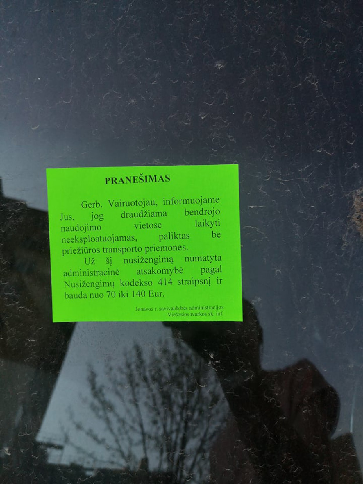 Jei jūsų automobilis jau kurį laiką stovi kieme neeksploatuojamas, neturi privalomojo civilinės atsakomybės draudimo ar galiojančios techninės apžiūros, tikėtina, kad vieną dieną ant jo lango rasite užklijuotą ryškų lipduką su perspėjimu apie gręsiančią baudą. Pastarieji vis ,,papuošia" ir skirtingose Jonavos gatvėse stovinčius automobilius – taip Jonavos rajono savivaldybės administracijos Viešosios tvarkos skyrius bando kovoti su neatsakingais vairuotojais.
