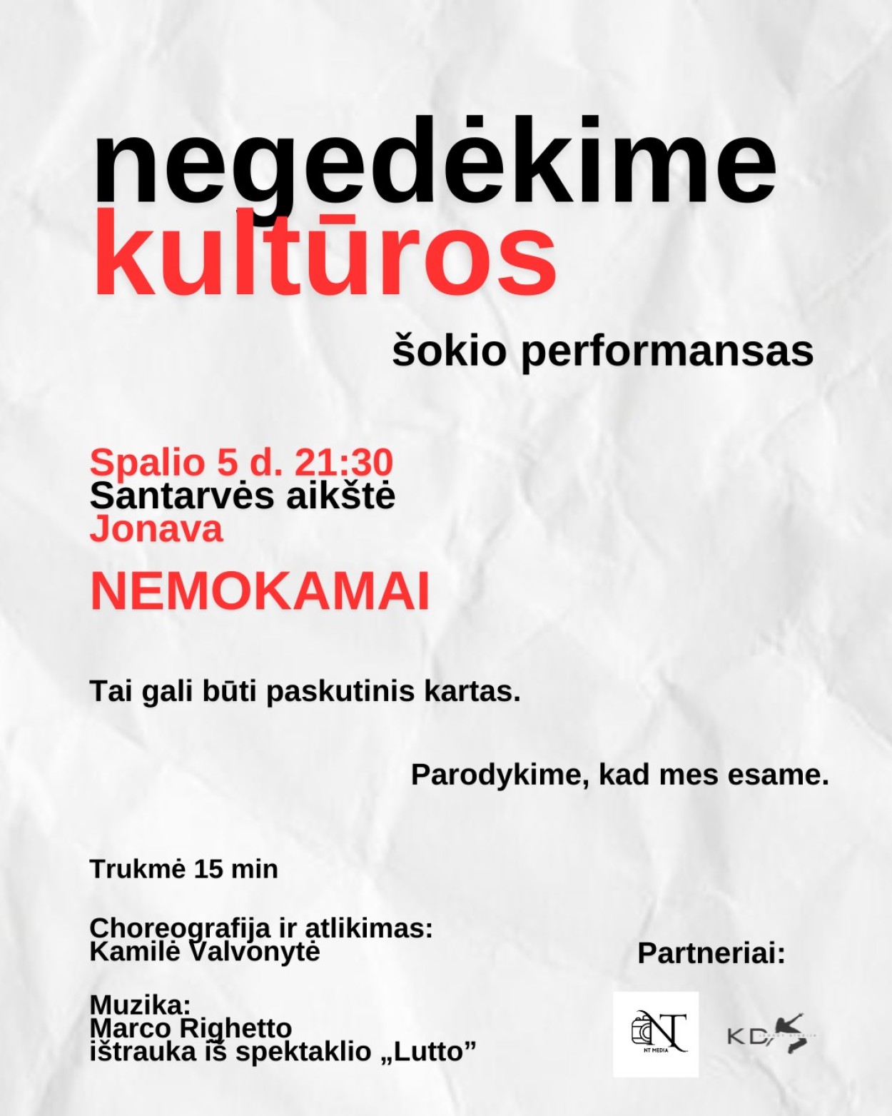 - 21:30 Šokio performansas „Negedėkime kultūros“ (šok. Kamilė Valvonytė) / Santarvės a.