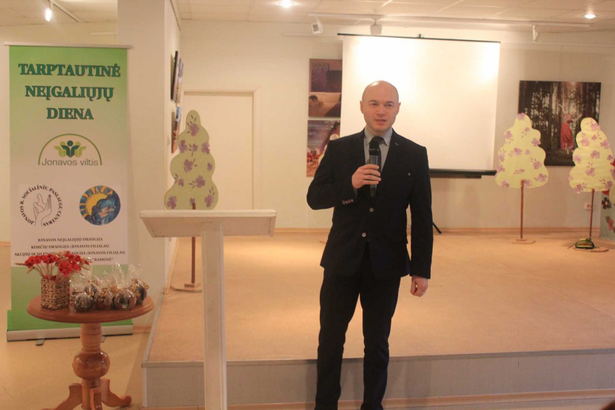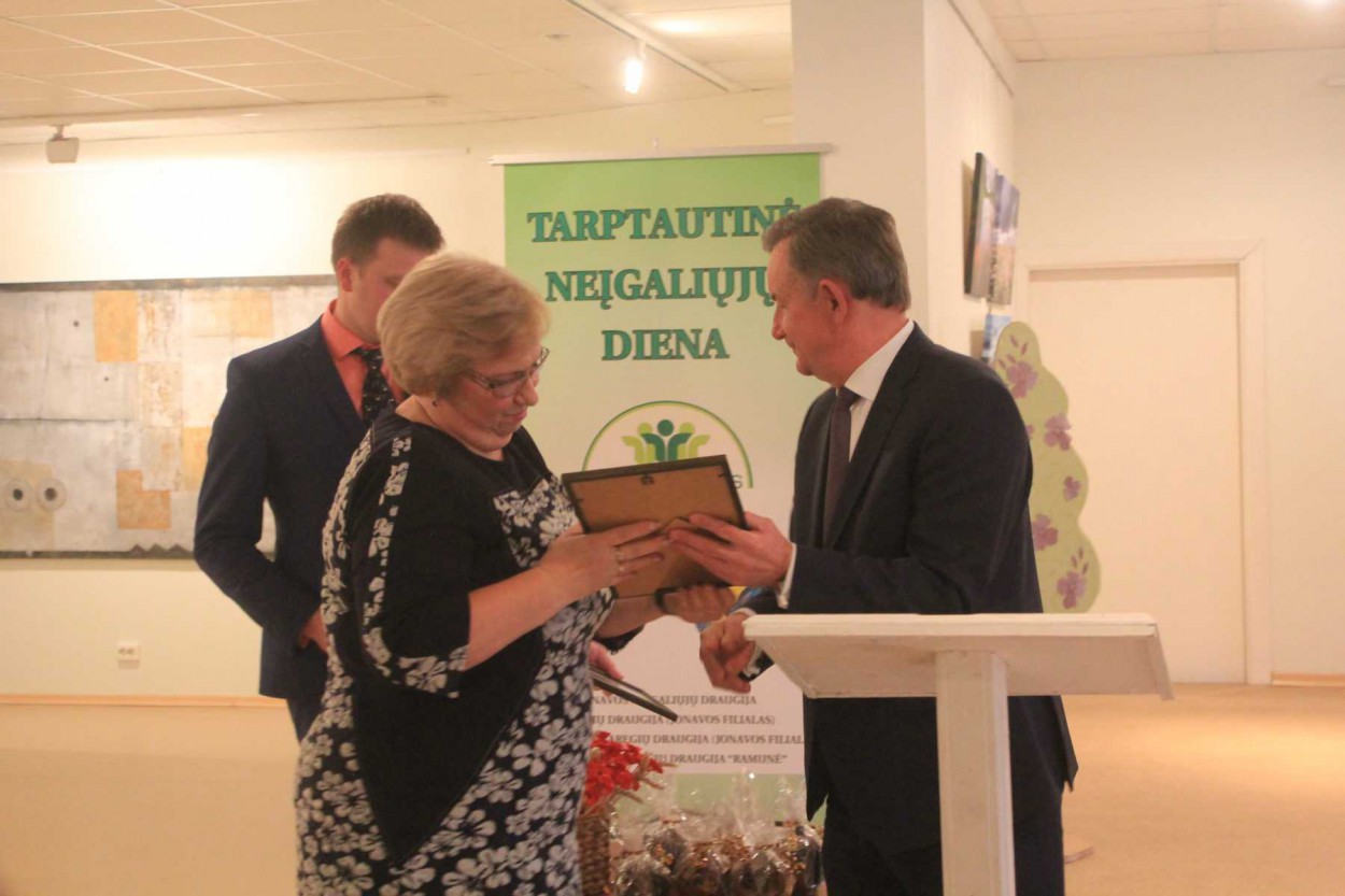 Penktadienio popietę Jonavos kultūros centro meno galerijoje paminėta Tarptautinė neįgaliųjų diena. Jonavos krašto neįgaliuosius, taip pat su jais dirbančias organizacijas sveikino Susisiekimo ministras Rimantas Sinkevičius, Seimo narė, socialinių reikalų komiteto pirmininkė Kristina Miškinienė, rajono vicemeras Eugenijus Sabutis, kiti svečiai.