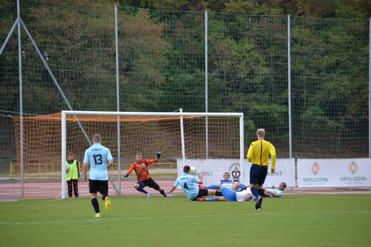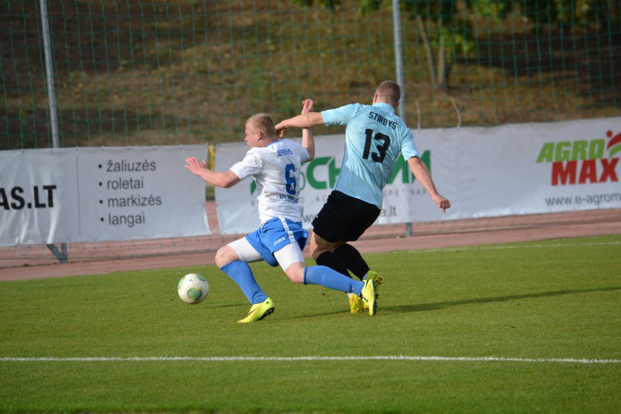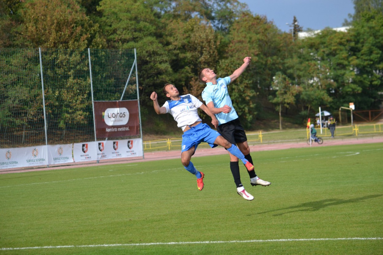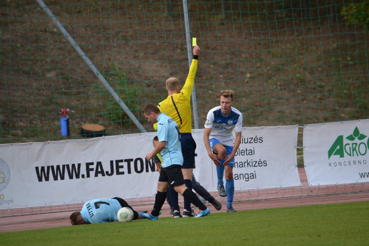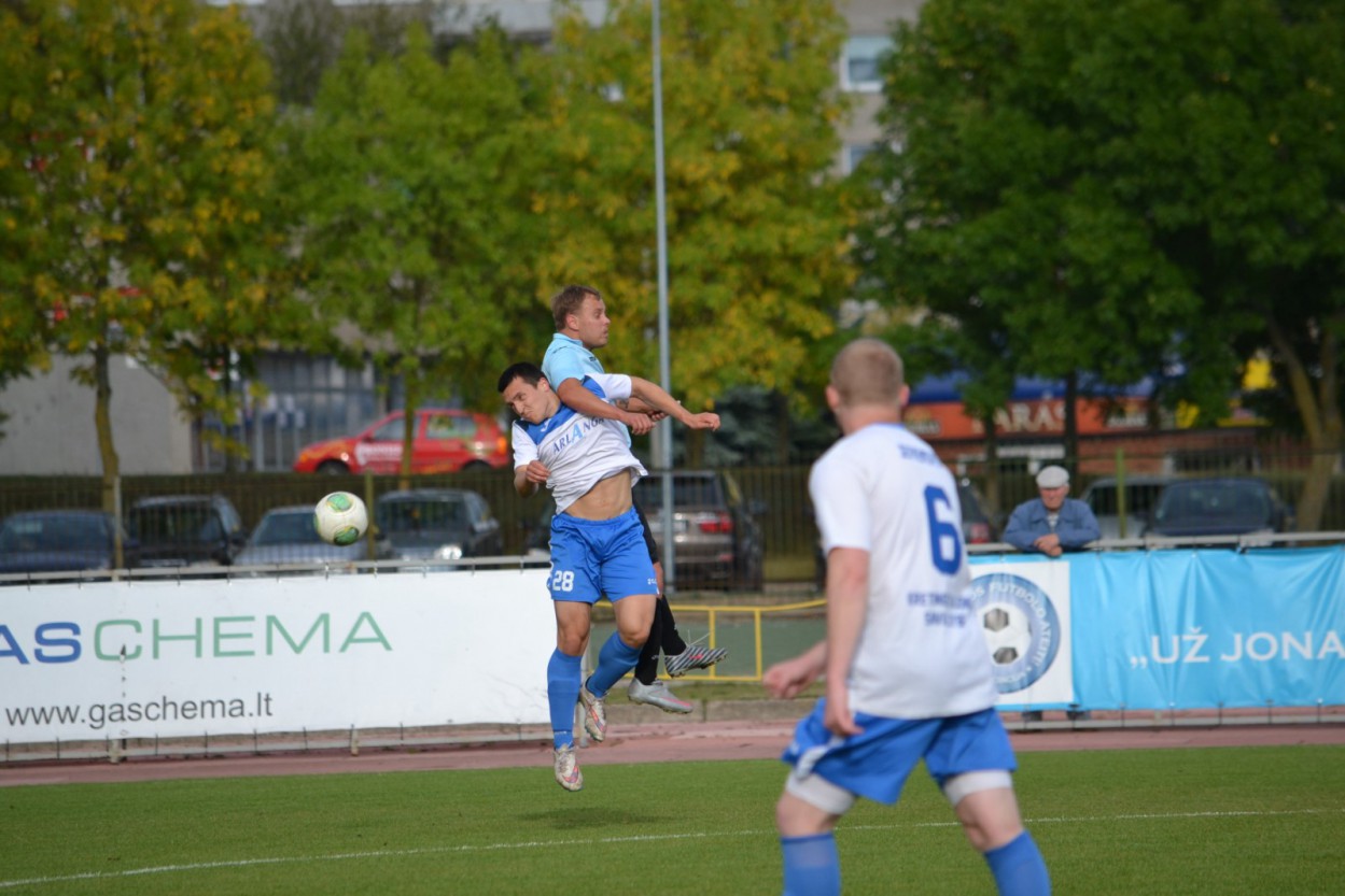 Pirmosiomis rungtynių minutėmis praleidę įvartį, jonaviečiams tik 57 min. pavyko atstatyti pusiausvyrą, kai 23 įvartį čempionate pavyko pelnyti Laurynui Stonkui. Visgi, iki pat dvikovos pabaigos neišnaudotos progos davė tik tašką, o paskutinėmis minutėmis dar raudoną kortelę užsidirbęs Arnas Gabulas kartu su Mariumi Ganusausku privalės praleisti kitas rungtynes su „Šilute“.