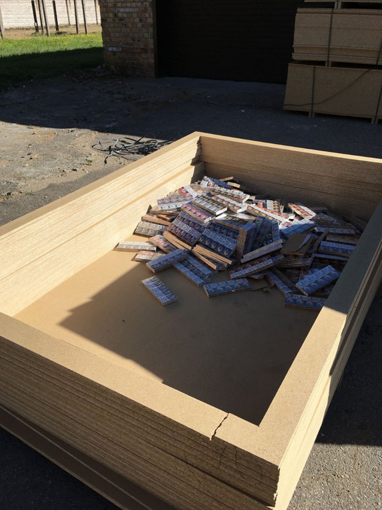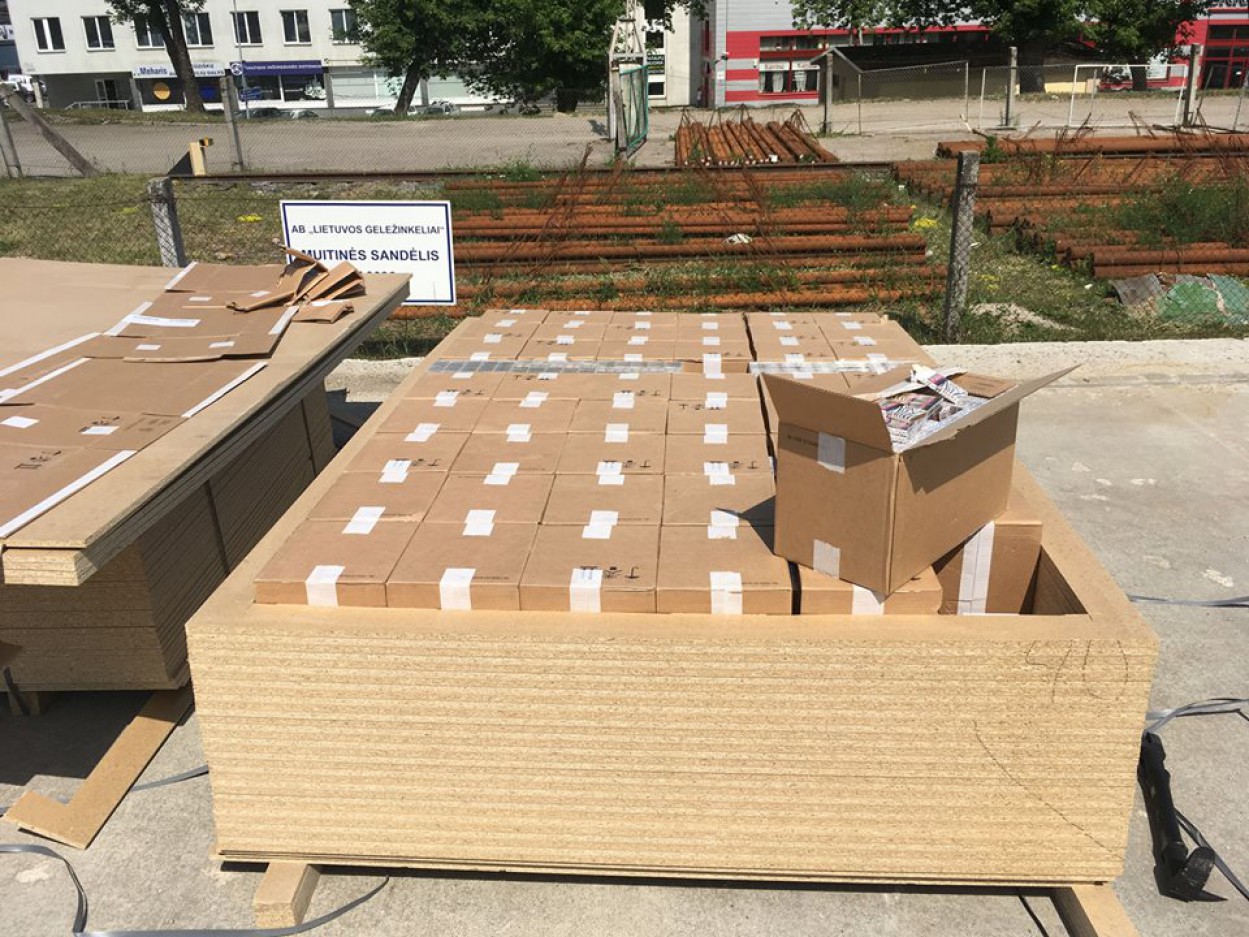 Lietuvos muitinės nuotraukose - birželis 1 d. įkliuvo stambi kontrabandinių cigarečių siunta. Apie 900 tūkst. eurų vertės rūkalai buvo paslėpti traukinyje, iš Baltarusijos gabenusiame medžio drožlių plokštes, kuriose įrengtos slėptuvės pareigūnų pramintos „karstais“.