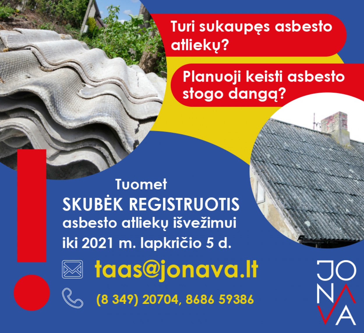 Paslaugą savivaldybė galės teikti tik žinodama realų poreikį ir gavusi valstybės finansavimą, todėl prašome nedelsti ir registruotis el. paštu taas@jonava.lt, nurodant apytikslį asbesto atliekų kiekį, tikslų adresą, iš kur suderintu laiku bus išvežamos asbesto atliekos, asbesto turėtojo vardą, pavardę ir telefono numerį.