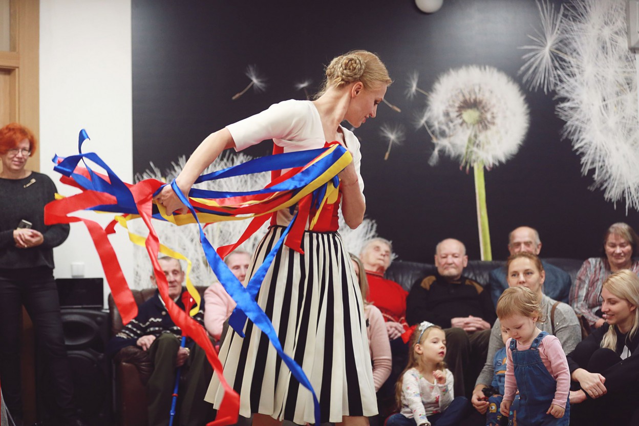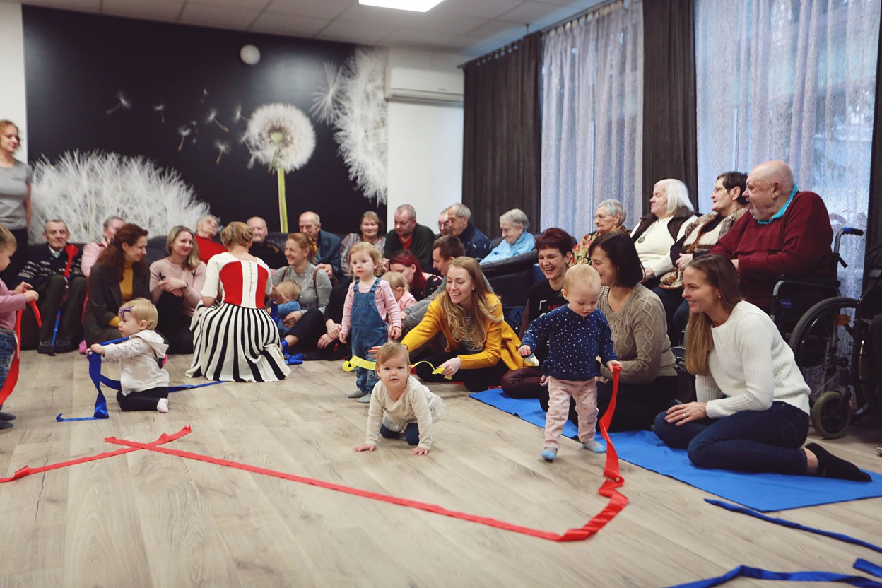 "Dansemos" šokėja Giedrė Subotinaitė ir choreografė Birutė Banevičiūtė susirinkusiems parodė Auksiniu scenos kryžiumi apdovanotą, daugiau nei 15 užsienio šalių pristatytą interaktyvų šokio spektaklį "Spalvoti žaidimai". Spektaklio metu mažieji žiūrovai buvo kviečiami kartu su šokėja improvizuoti, o spektaklio pabaigoje ir senoliai buvo pakviesti išbandyti keletą judesių. Tad pabaigoje judėjo ir maži, ir dideli, ir jauni, ir seni. Kaip teigė choreografė B. Banevičiūtė "mums jau seniai brendo mintis parodyti mūsų spektaklius seneliams, bet vis nerasdavome progos. Tad šis kvietimas mums buvo labai malonus ir svarbus".