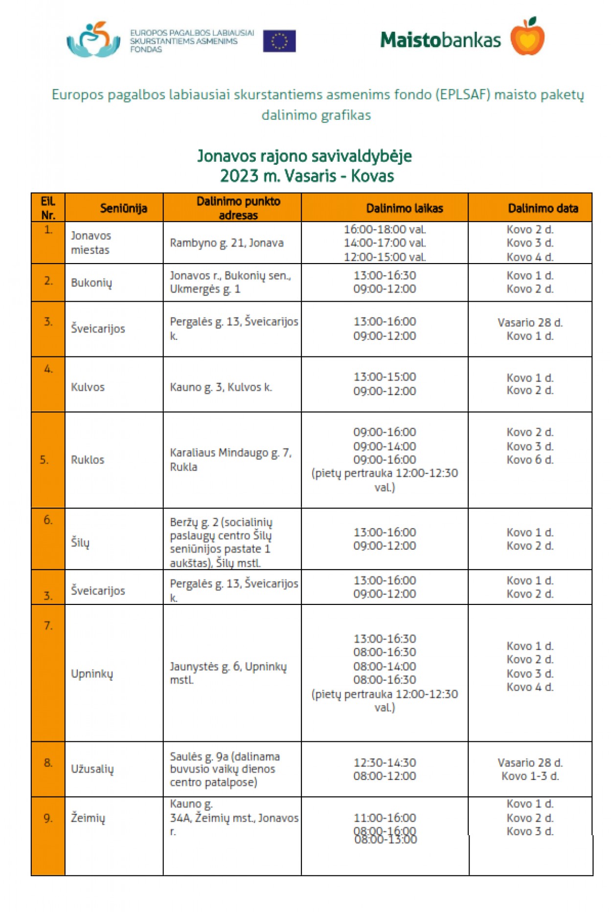 Parama dalijama daugiau nei 600 punktų visoje Lietuvoje. Dėl tikslaus dalijimo laiko gyventojai turėtų kreiptis į savo seniūniją arba šios informacijos ieškoti savo savivaldybės administracijos bei „Maisto banko“ interneto puslapiuose.