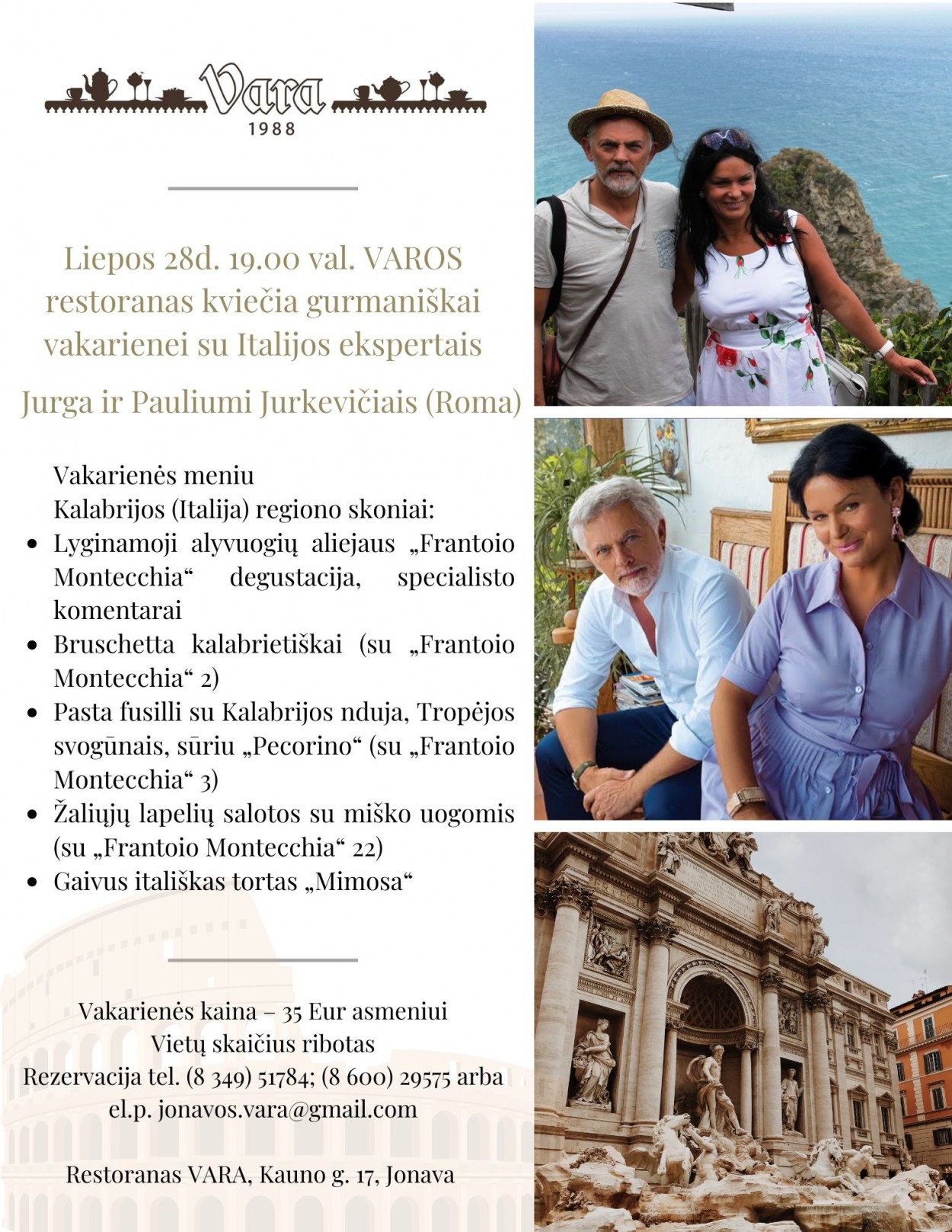 Ateinantį trečiadienį Kalabrijos produktai, atkeliavę kartu su Jurga ir Pauliumi iš Italijos lagamine, atsidurs ant Jonavos gurmanų stalo. Jie kvepės nuostabiais Kalabrijos aromatais - granatais, bergamotėmis, raudonėliais. Nėra Kalabrijoje ūkininko, kurio darže nesipuikuotų šviežiausios prieskoninės žolės, kurias Jurga ir Paulius derins Jonavos restorane „Vara“ prie baklažanų su ančiuviais brusketos.