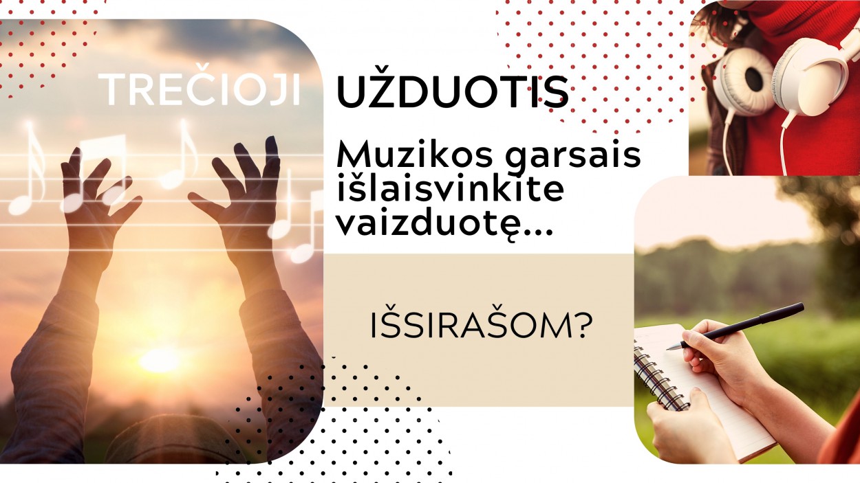 Muzikos garsais išlaisvinkite vaizduotę. Pirmiausia užsimerkite ir leiskite sau įsiklausyti į muziką (Sigur Rós – Sæglópur kūrinys). Leiskite sau smalsiai tyrinėti kokius vaizdinius, prisiminimus šie muzikos garsai sukelia, kaip kinta kūno pojūčiai, kokios temos iškyla. Pasibaigus muzikos kūriniui, leiskitės į rašymo ir vaizduotės kelionę. Tiesiog leiskite sau rašyti tai, kas rašosi. Jei norisi, galite tęsti pradėtus rašyti kūrinius antroje užduotyje. Svarbu, kad rašytumėte lengvai ir su pasimėgavimo paskoniu.
