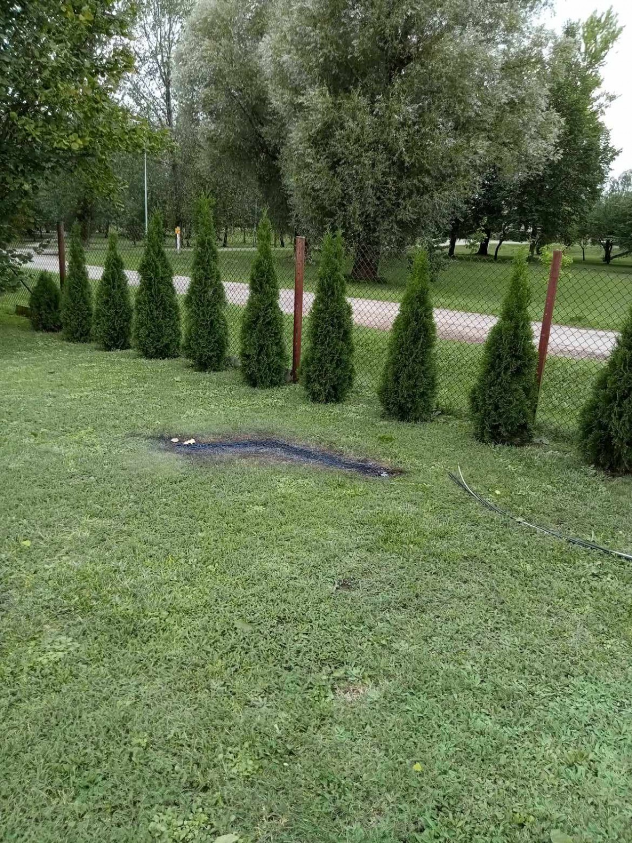 Atvykę ugniagesiai gelbėtojai aptiko, kad elektros laidas buvo nukritęs ant žolės, privataus namo kieme, netoli gyvenamojo pastato. Nuotraukoje matyti, kaip žolę išdegino nukritęs elektros laidas. Laimei, didesnių nuostolių pavyko išvengti.