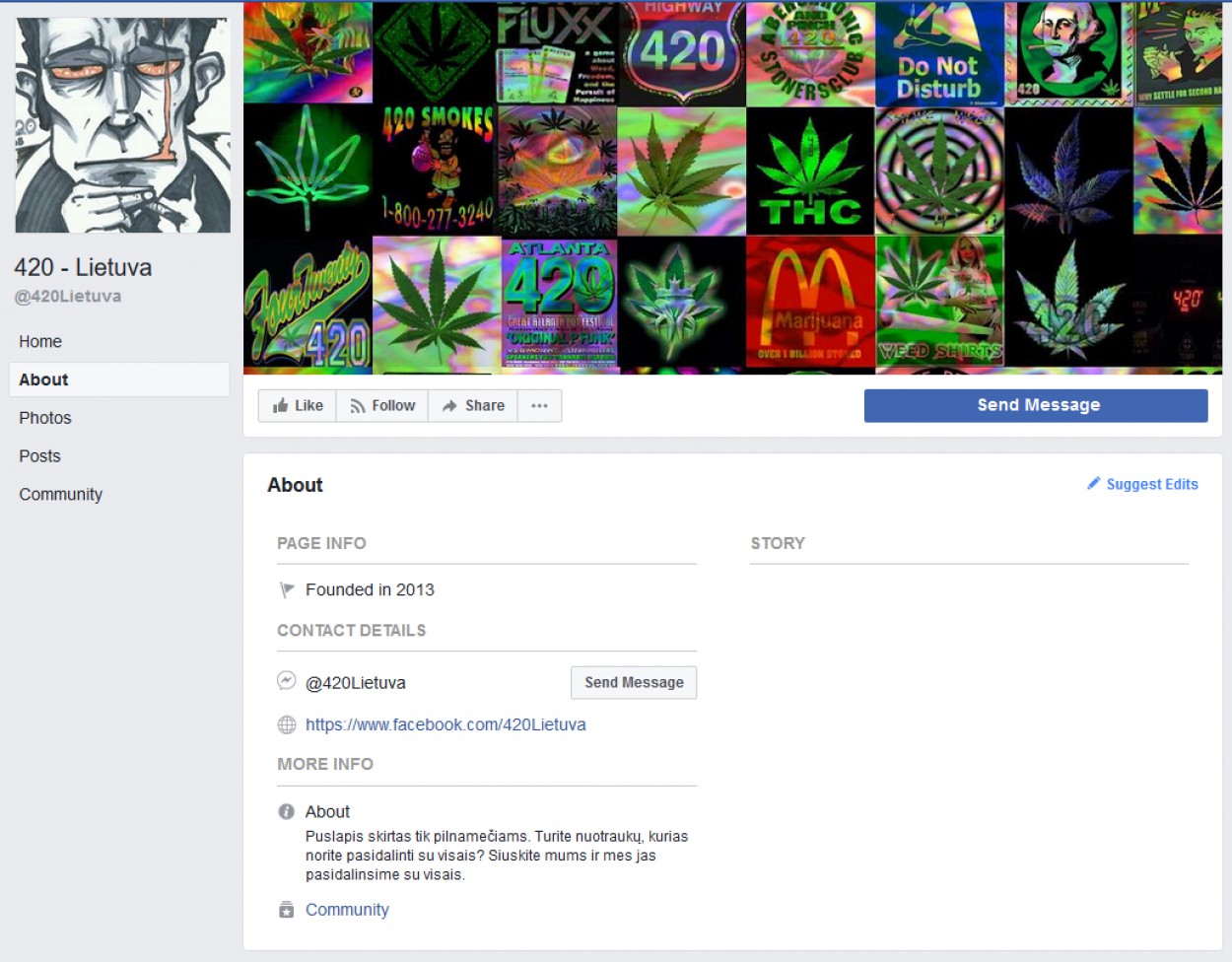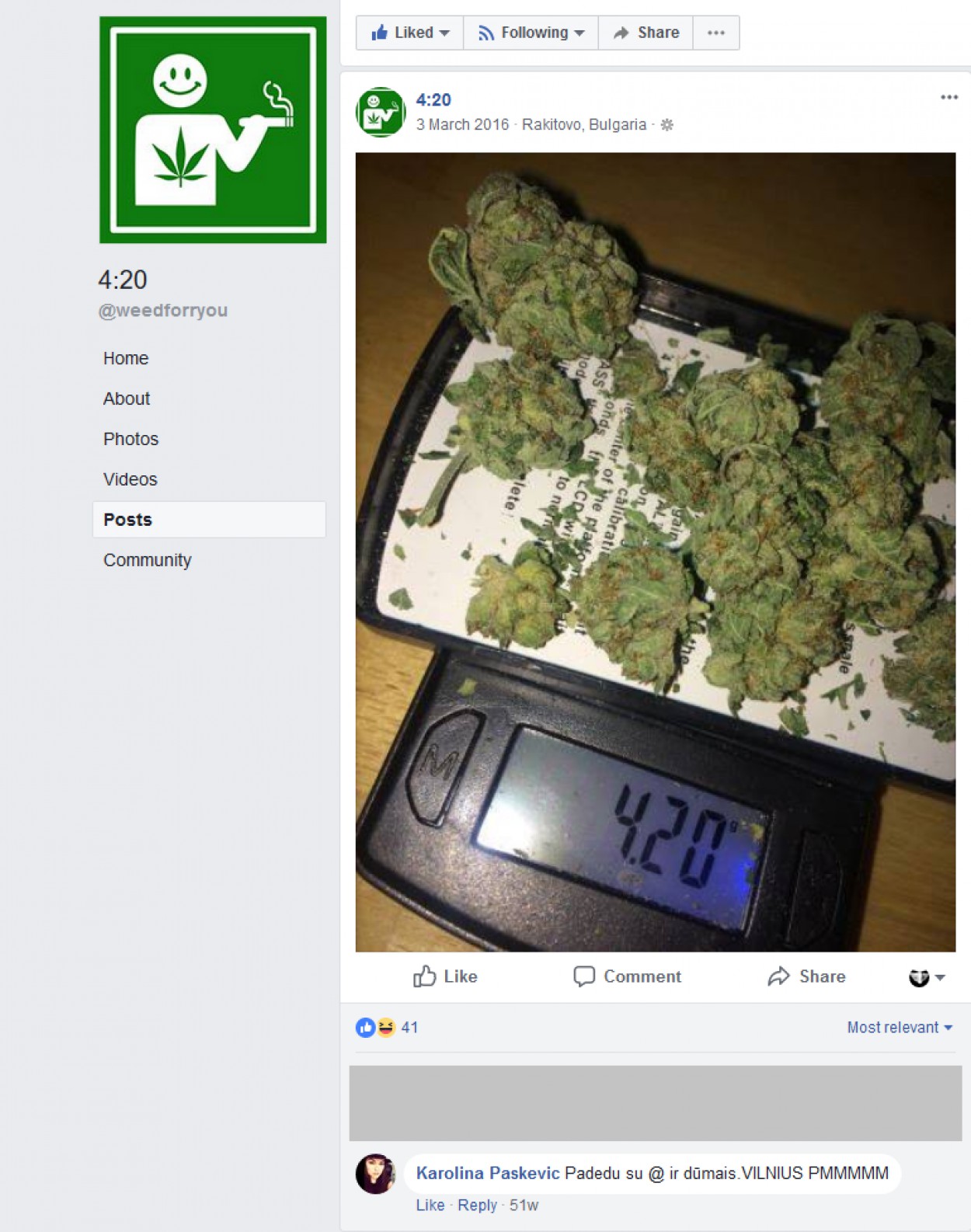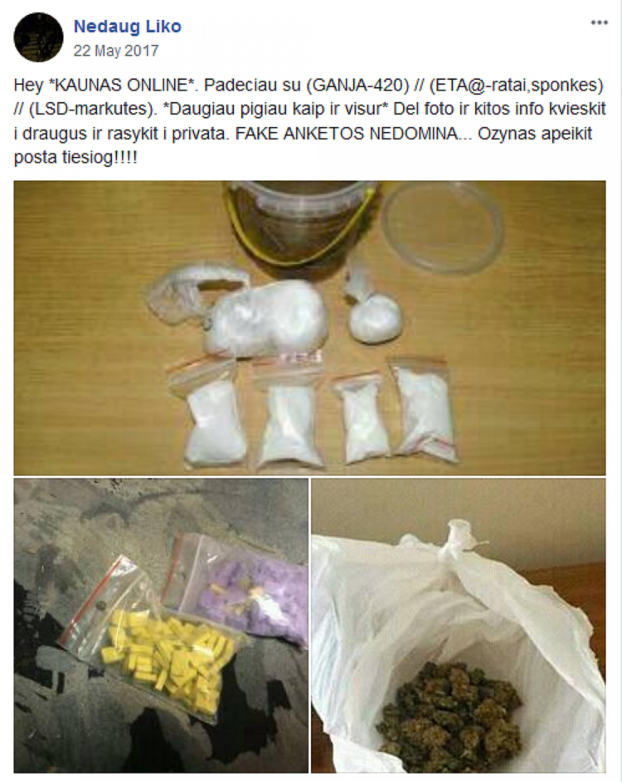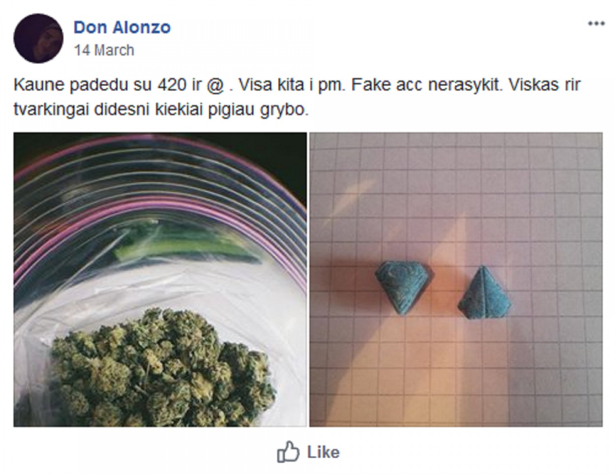 Nustatyta, kad šių socialinio tinklalapio „Facebook“ naudotojų grupių nariai nuolat talpina, atnaujina ir įkelia skelbimus su įvairaus pobūdžio siūlymais (tiek atviro, tiek užšifruoto turinio) įsigyti įvairių narkotinių ar psichotropinių medžiagų. Skelbimuose nurodomos narkotinių ar psichotropinių medžiagų kainos, įsigijimo ir komunikavimo sąlygos bei būdai, siūlomų įsigyti narkotinių ar psichotropinių medžiagų nuotraukos. Parduodamos medžiagos dažniausiai nurodomos užšifruotai naudojant narkotinių ar psichotropinių medžiagų šifruotus pavadinimus (slapyvardžius): „420“, „@“, „žolė“, „chimkė“, „coco“, „stuff“ ir pan., kurie puikiai žinomi asmenims vartojantiems narkotines ar psichotropines medžiagas, o taip pat ir policijai.