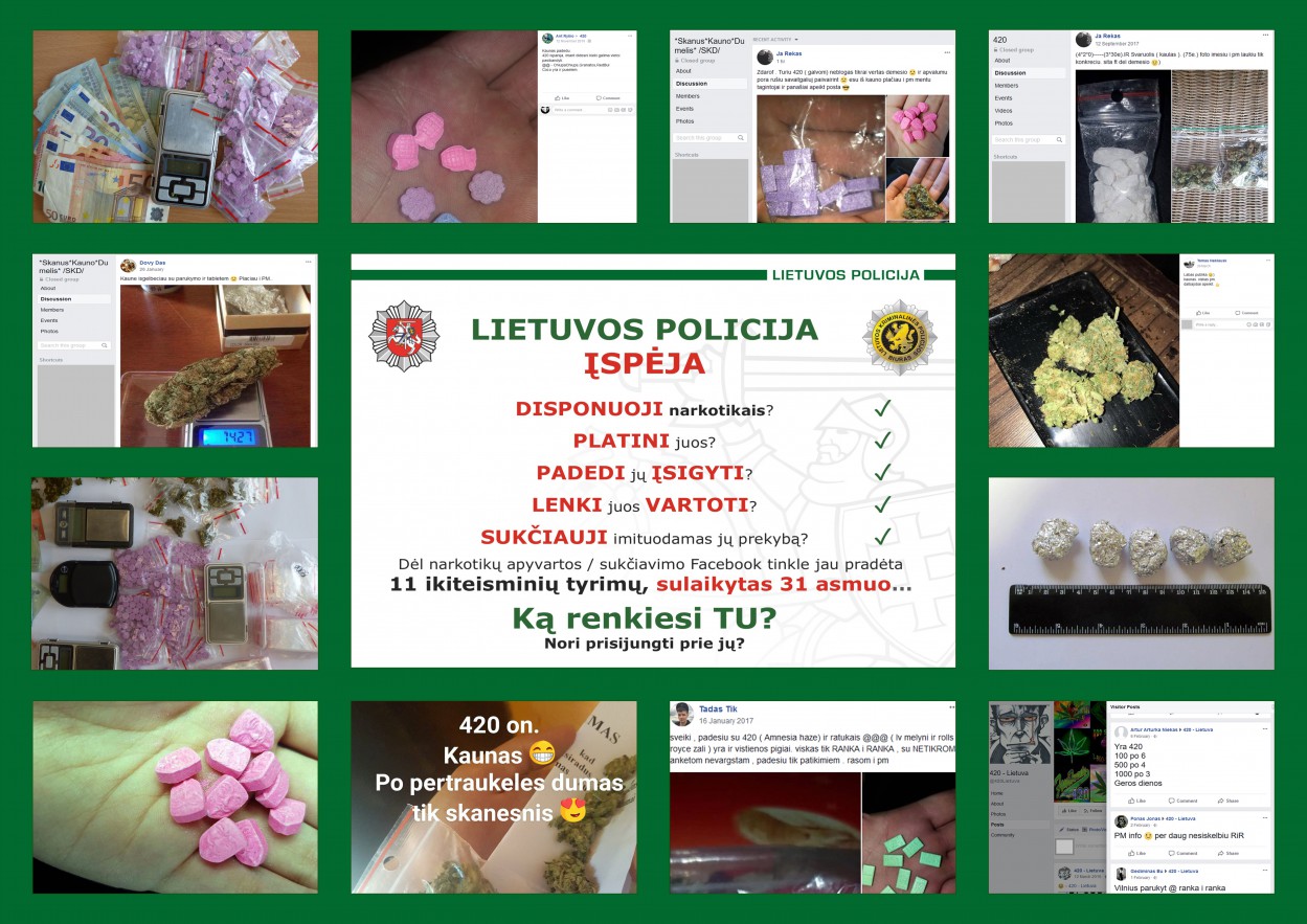 Dėl šių nusikalstamų veikų, numatytų Lietuvos Respublikos baudžiamojo kodekso 259 str. 1-2 d. (Neteisėtas disponavimas narkotinėmis ar psichotropinėmis medžiagomis be tikslo platinti), 260 str. 1-2 d. (Neteisėtas disponavimas narkotinėmis ar psichotropinėmis medžiagomis turint tikslą jas platinti) pradėti ir atliekami 11 ikiteisminių tyrimų, sulaikytas 31 Lietuvos Respublikos pilietis neteisėtai disponavęs ar platinęs narkotines ar psichotropines medžiagas ,,Facebook” socialiniame tinkle.
