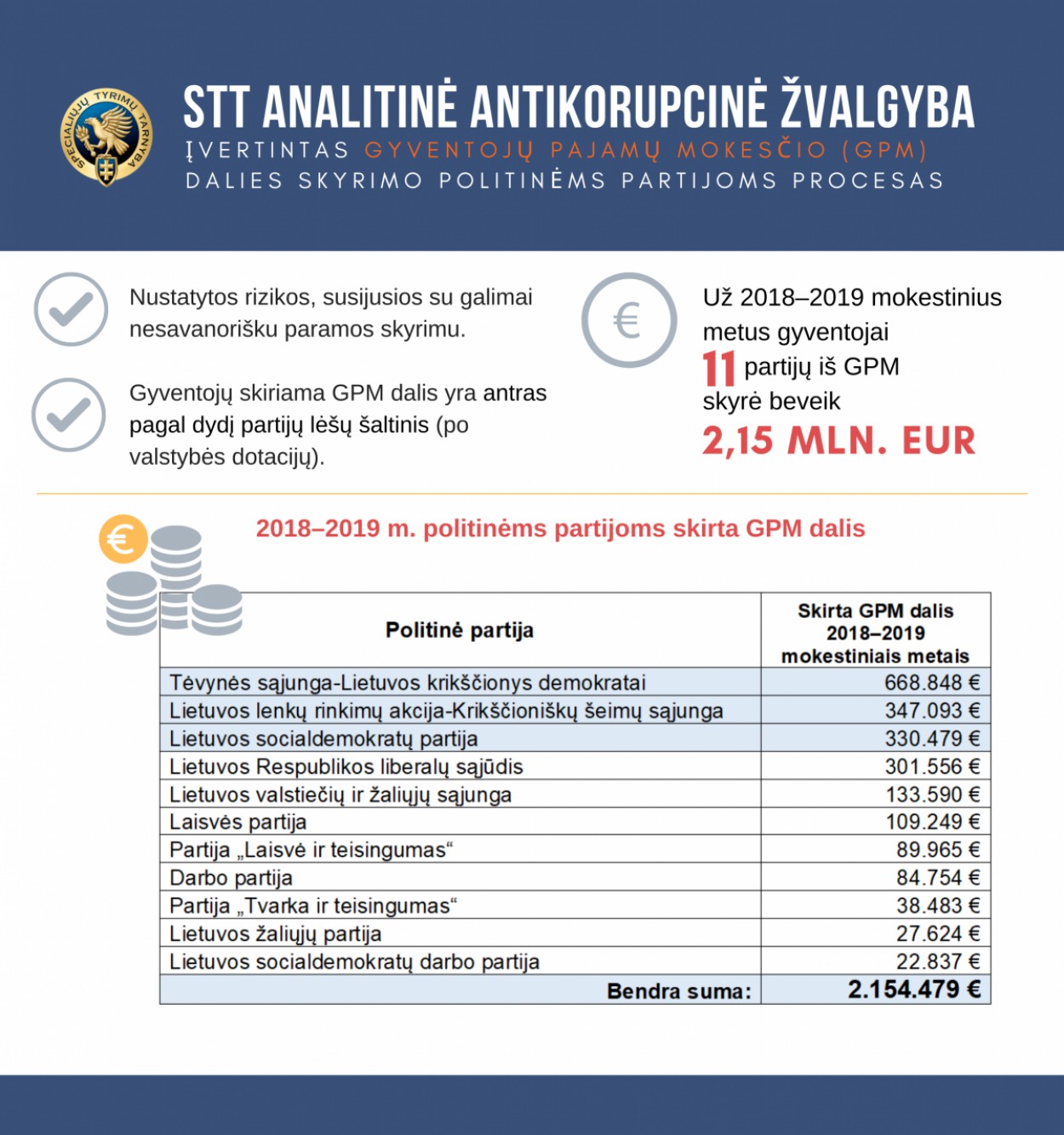 Specialiųjų tyrimų tarnybos (STT) analitinės antikorupcinės žvalgybos specialistai įvertino gyventojų pajamų mokesčio (GPM) dalies skyrimo politinėms partijoms procesą ir nustatė rizikas, susijusias su galimai nesavanorišku paramos skyrimu.