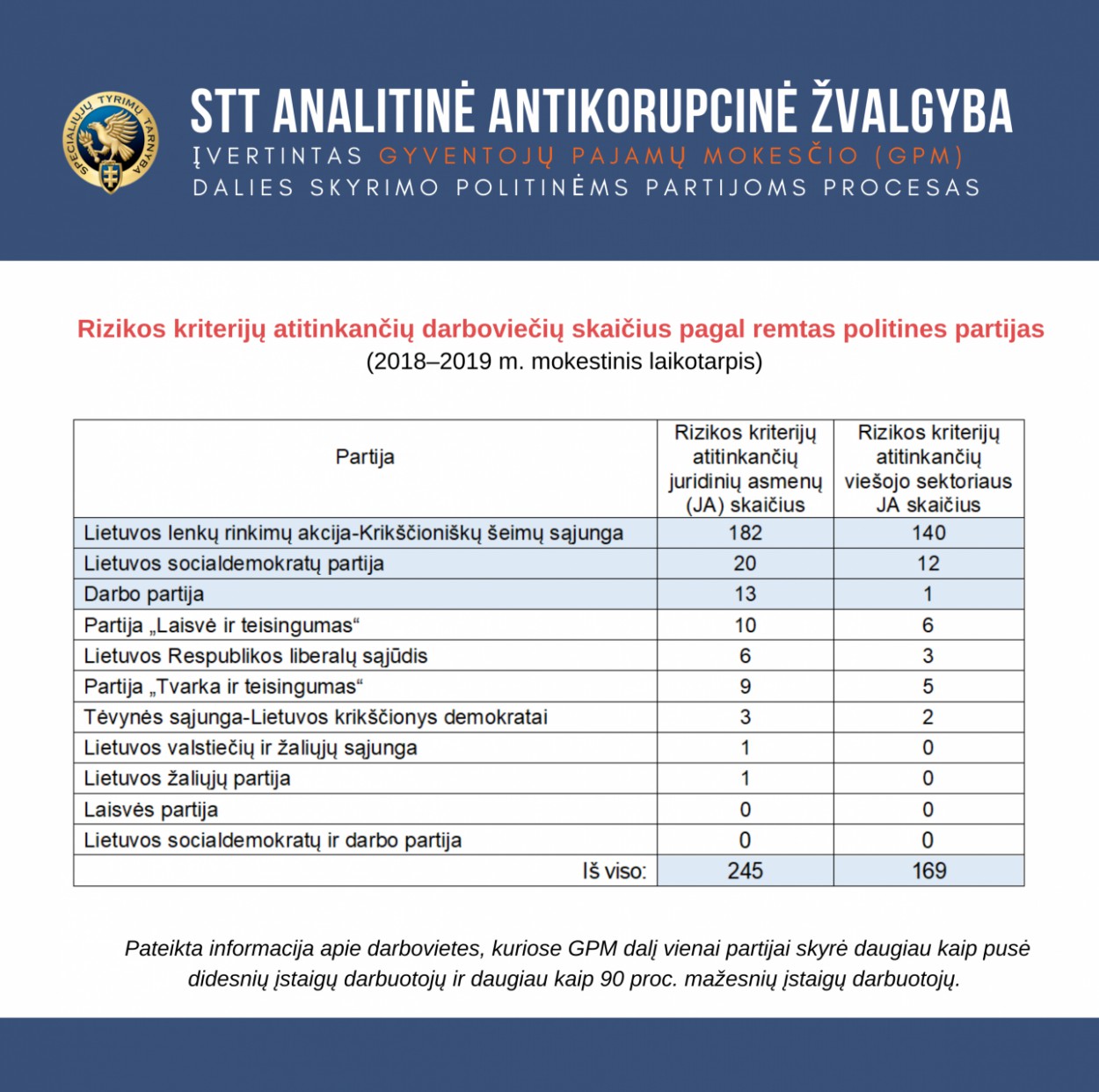 Analizės metu nustatytos 169 viešojo sektoriaus institucijos ir 76 privataus sektoriaus įmonės, kuriose GPM dalis buvo skiriama išskirtinai kuriai nors vienai iš partijų. Šiose įmonėse ir institucijose kuriai nors vienai partijai GPM dalį skyrė daugiau kaip pusė didesnių įstaigų darbuotojų ir daugiau kaip 90 proc. mažesnių įstaigų darbuotojų. Šio tyrimo kontekste didesnėmis įstaigomis laikomos tos, kuriose GPM dalį politinei partijai skyrė bent 10 darbuotojų, o mažesnėmis įstaigomis – kuriose GPM dalį skyrė mažiau nei 10, tačiau bent 5 darbuotojai. Bendras juridinių asmenų, kurių darbuotojai skyrė GPM dalį 2018–2019 metais, skaičius buvo 19 897, taigi, šiuo aspektu galimai rizikingais laikytini 1,2 proc. juridinių asmenų.
