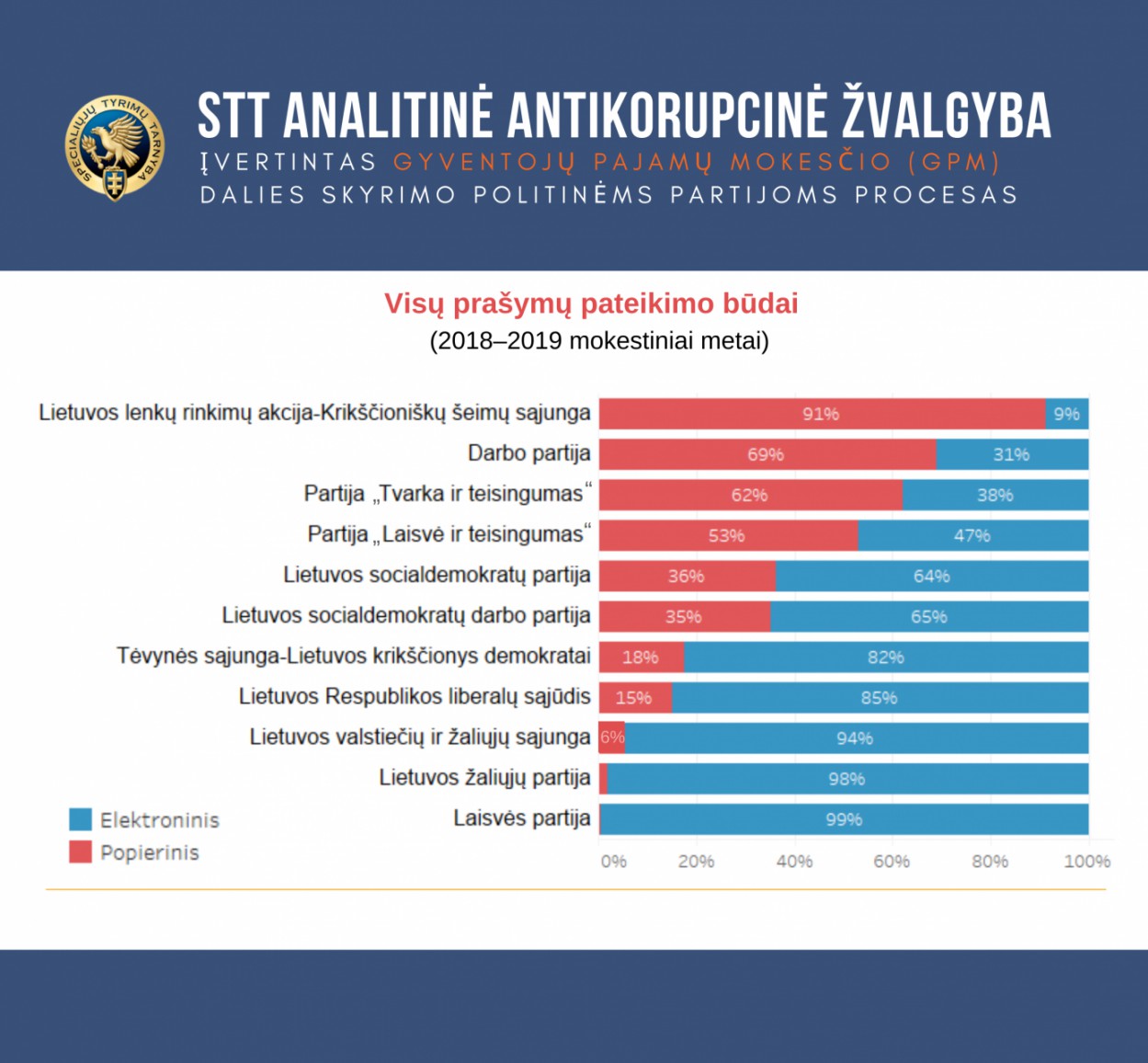 Pastebėtina, kad skiriant GPM dalį partijoms dominavo rizikingesne laikoma popierinė prašymo pateikimo forma. Didžiojoje dalyje analizuotų įstaigų (213 įstaigų) virš 80 proc. prašymų dėl GPM dalies skyrimo partijoms pateikti popierine, o ne elektronine forma.