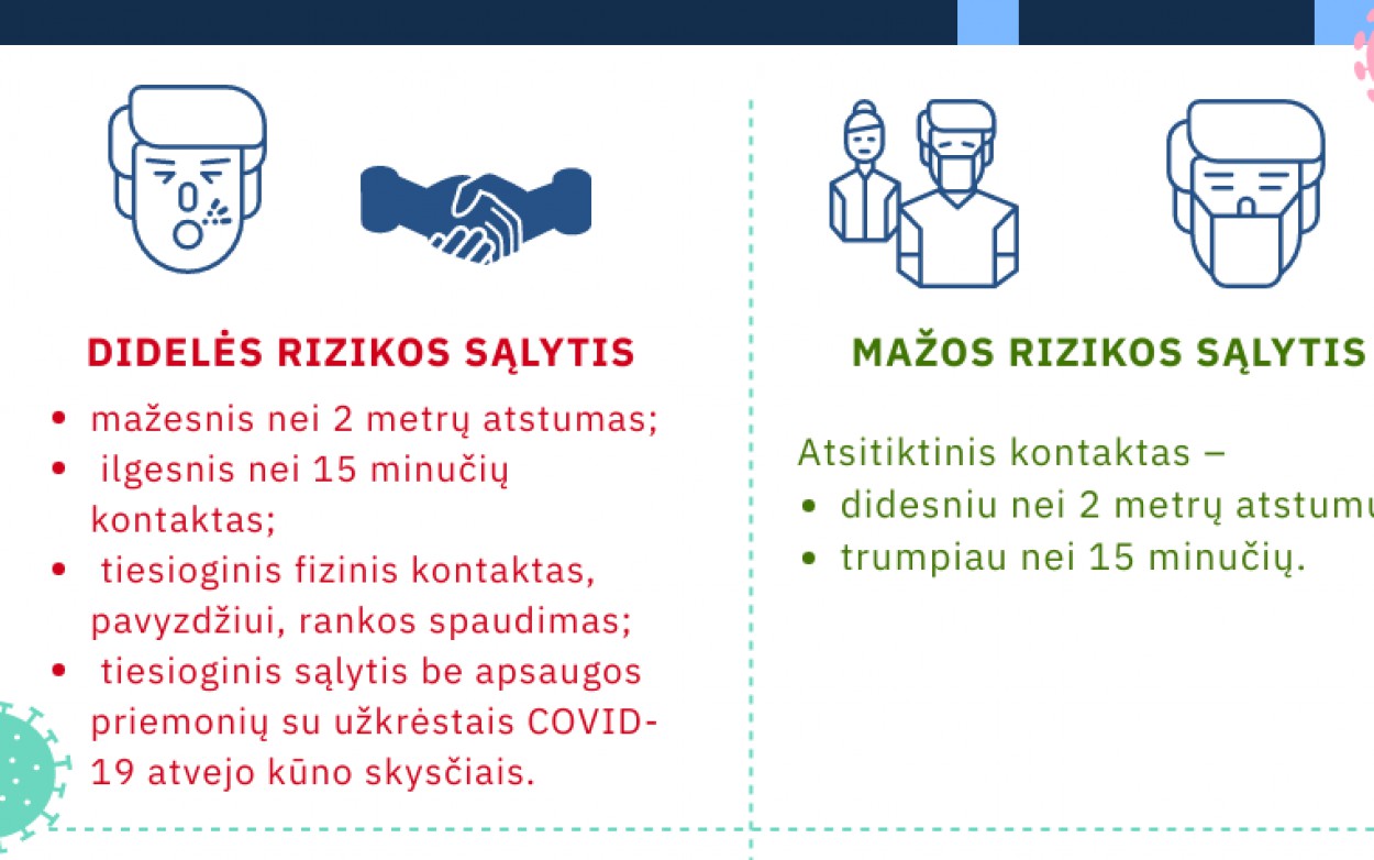 Mažos rizikos sąlytį su užsikrėtusiuoju koronavirusu turėjusiu laikomas žmogus, bendravęs didesniu nei 2 metrų atstumu trumpiau nei 15 minučių.
