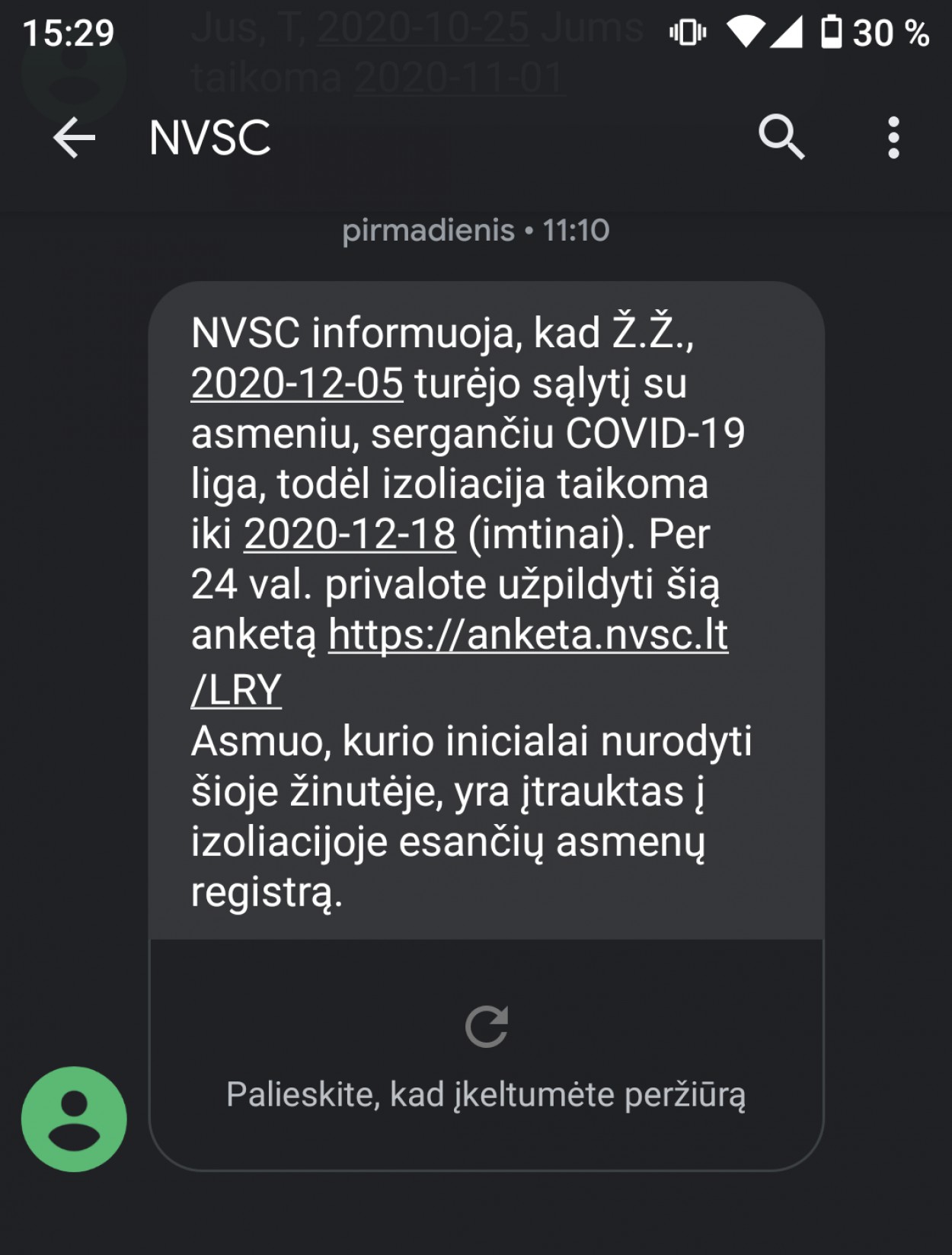 - Be to, NVSC siunčiamose žinutėse nėra prašoma atsakyti į atsiųstą žinutę ir taip pateikti savo asmens duomenis, o siunčiama nuoroda į anketą, kurią prašoma užpildyti.