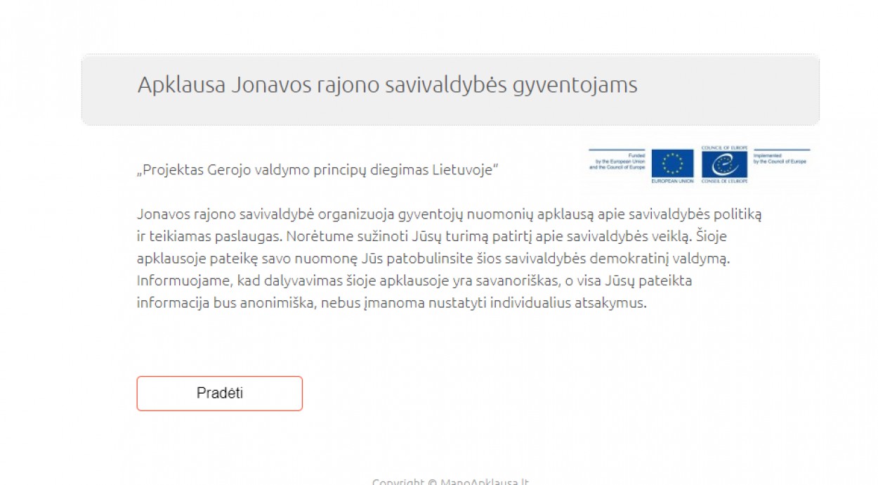 Norima sužinoti Jūsų turimą patirtį apie savivaldybės veiklą. Šioje apklausoje pateikę savo nuomonę Jūs patobulinsite šios savivaldybės demokratinį valdymą.