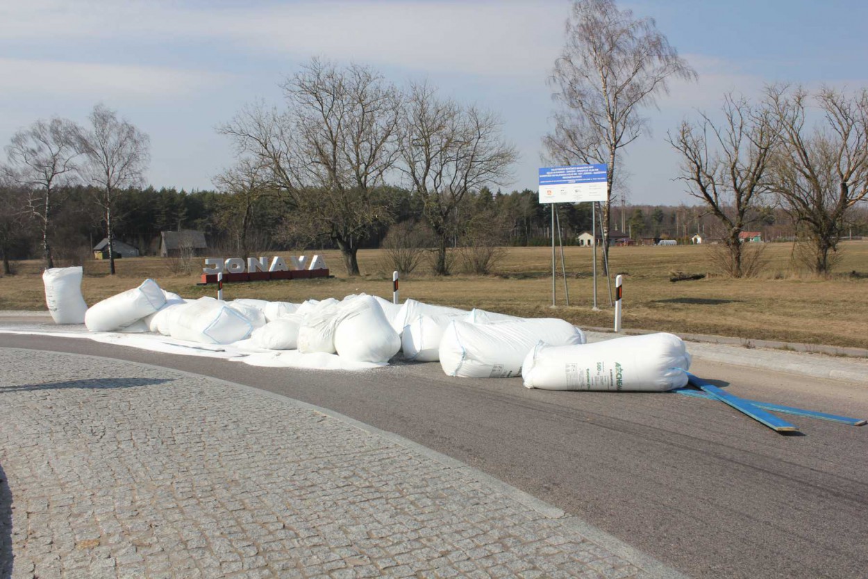 Antradienį apie vidurdienį išbiro iš sandėlių ūkininkui vežami maišai su karbamidu. Maišai buvo vežami iš sandėlio, o krovininis automobilis neišsiteko žiedinėje sankryžoje – šiam pasvirus, iškrito daugiau nei dvidešimt maišų.