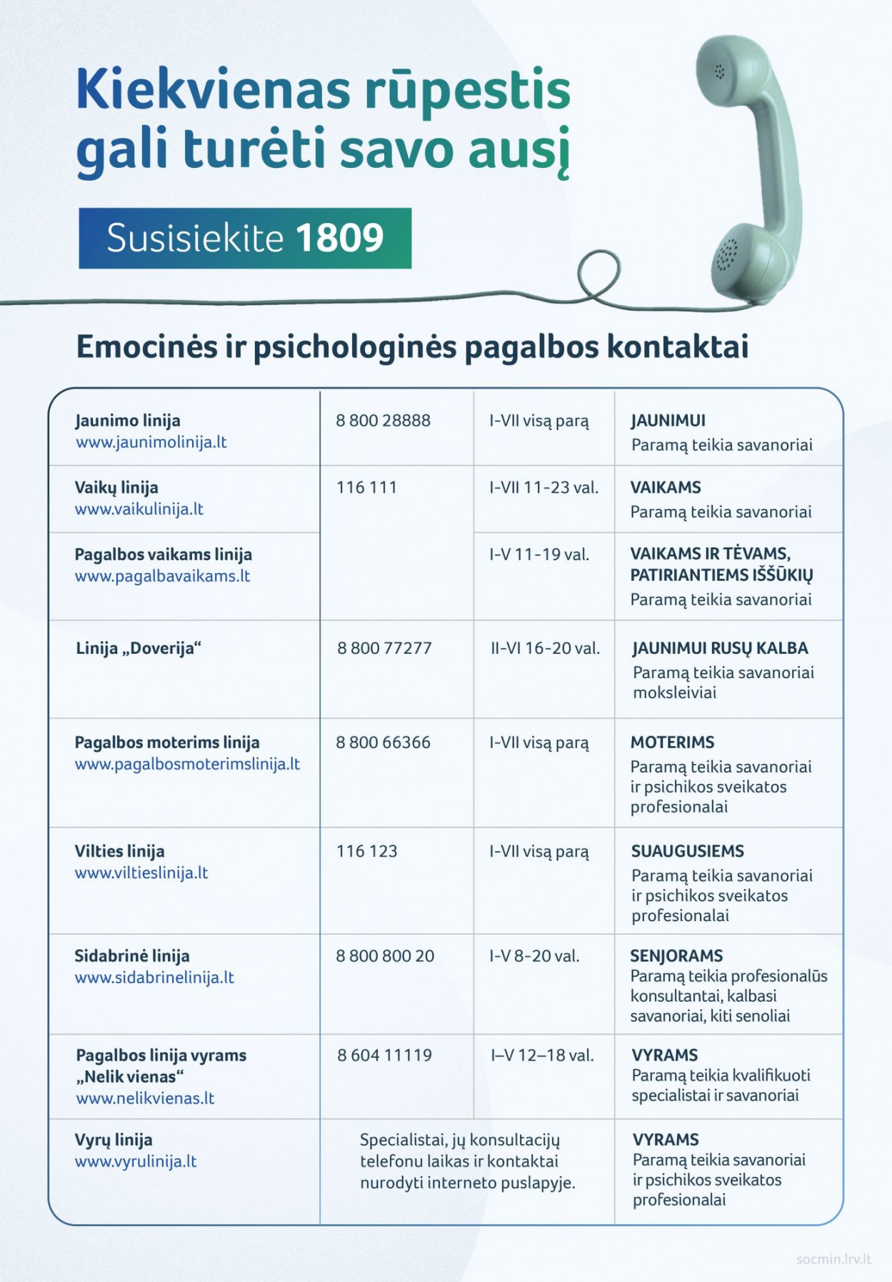 Socialinės apsaugos ir darbo ministerija primena, kad Lietuvoje veikia ne viena pagalbos linija, kurioje savanoriai ir savo sričių profesionalai pasirengę suteikti pagalbą, išklausyti, patarti ar tiesiog pasikalbėti.
