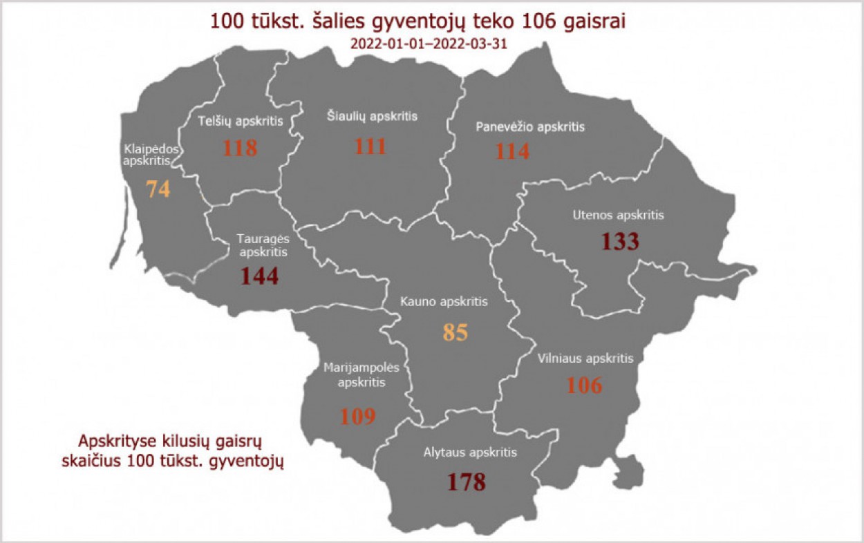Per 3 šių metų mėnesius gaisruose žuvo 26 žmonės, o 28 gyventojai patyrė traumų. Palyginti su praėjusių metų tuo pačiu laikotarpiu, kai buvo užgesinti 2237 gaisrai, o juose žuvo 37 gyventojai, šiemet gaisruose žuvo 11 gyventojų, arba 30 proc., mažiau. Tai mažiausias gaisruose žuvusių žmonių skaičius per 19 metų.