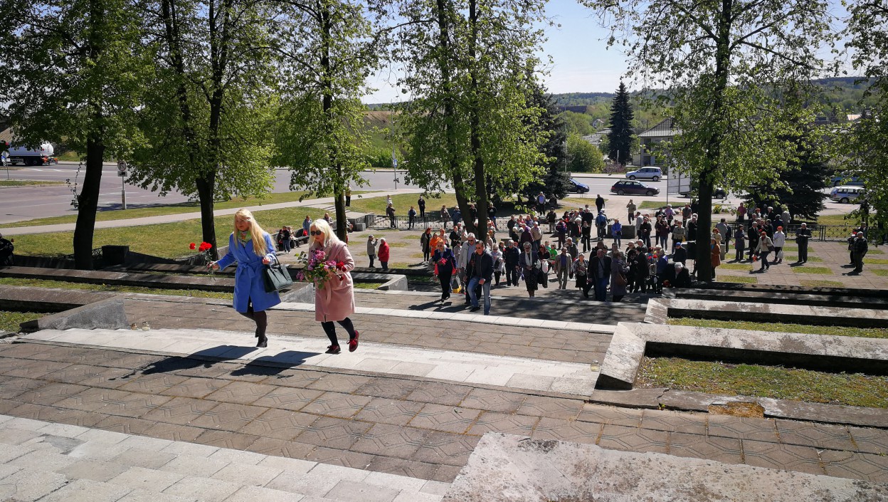 Pergalės dienos minėjimo, įvairaus amžiaus dalyviai, aidint rusiškai muzikai, rinkosi prie memorialo nešini gėlėmis bei žvakėmis, segėjo – Georgijaus juosteles.