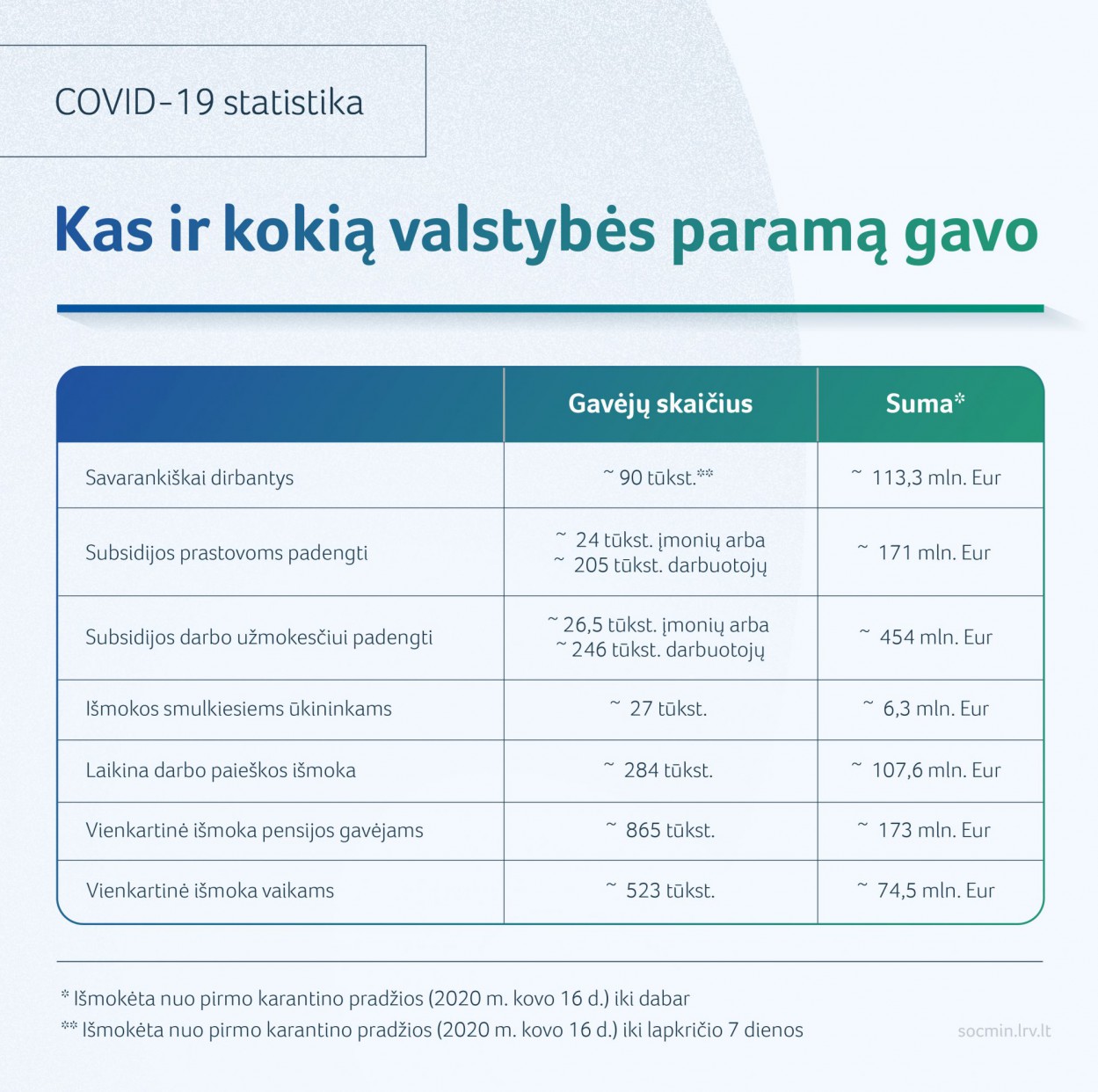 Socialinės apsaugos ir darbo ministerija primena, kokia valstybės parama dar gali pasinaudoti darbuotojai, darbdaviai, dirbantys savarankiškai, šeimos, auginančios vaikus, senjorai ir nepasiturintys žmonės iki 2020 metų pabaigos. Dalis pagalbos priemonių, skirtų sumažinti COVID-19 pasekmes šalies gyventojams, galios ir kitais metais, tačiau dalies jų galiojimas jau artėja į pabaigą.