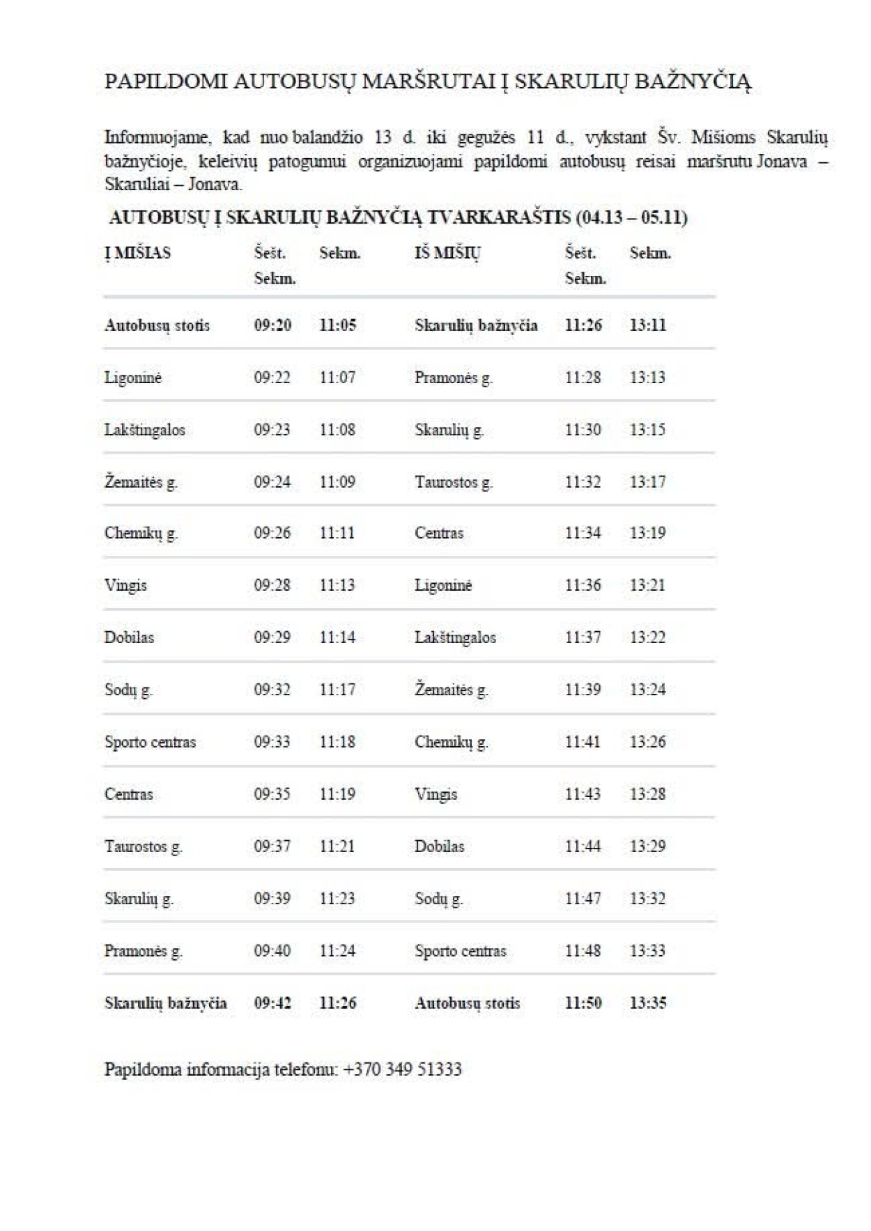 AUTOBUSŲ Į SKARULIŲ BAŽNYČIĄ TVARKARAŠTIS (04.13 – 05.11) Į MIŠIAS
