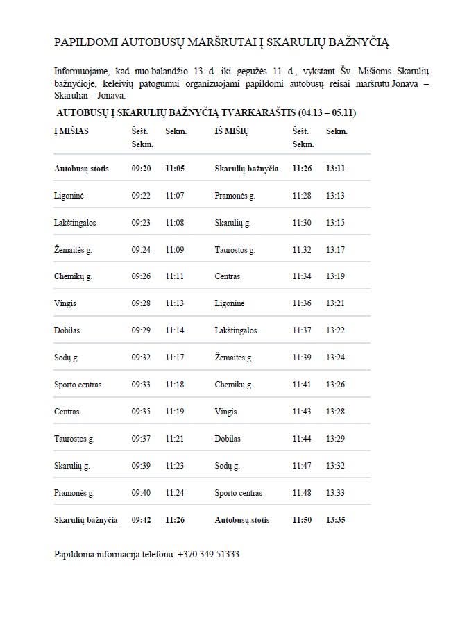 ,,Jonavos autobusai" informuoja, kad nuo balandžio 13 d. iki gegužės 11 d., vykstant Šv. Mišioms Skarulių bažnyčioje, keleivių patogumui organizuojami papildomi autobusų reisai maršrutu Jonava – Skaruliai – Jonava.
