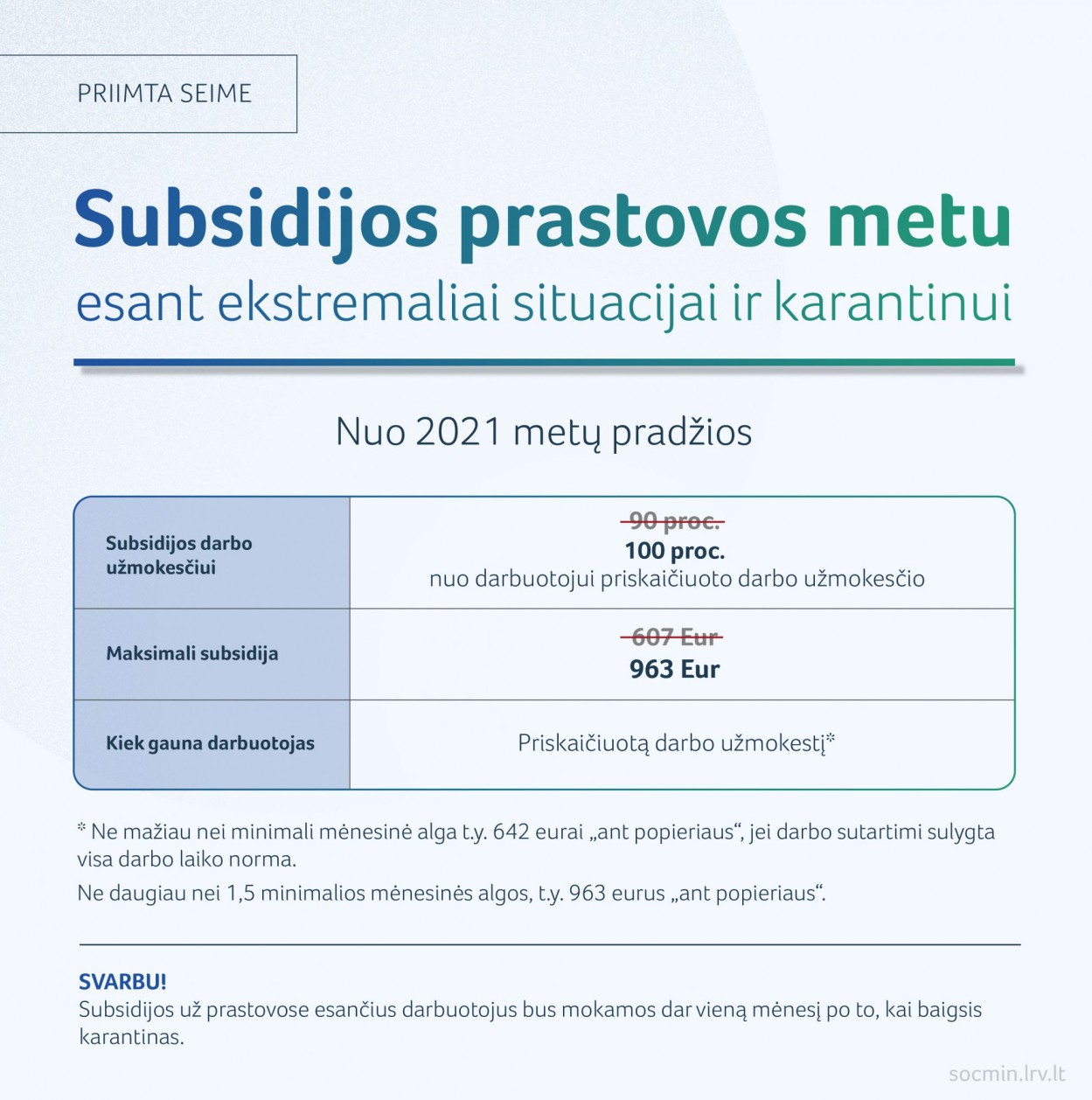 „Tęsiantis pandemijai, kitąmet prastovų subsidijos darbo užmokesčiui dydis bus siejamas su iki karantino darbuotojui priskaičiuotu darbo užmokesčiu. Naujas prastovų paramos modelis labiau atitiks realiai gautas šeimų pajamas ir padės lengviau išgyventi šį sudėtingą mums visiems laikotarpį. Su sunkumais susidūrę darbdaviai bus labiau motyvuoti išlaikyti savo darbuotojus“, – sako socialinės apsaugos ir darbo ministrė Monika Navickienė.